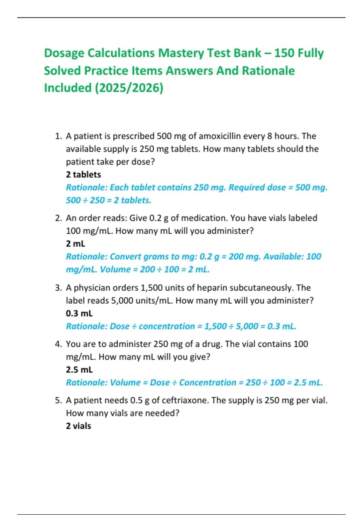 Dosage Calculations Mastery Test Bank – 150 Fully