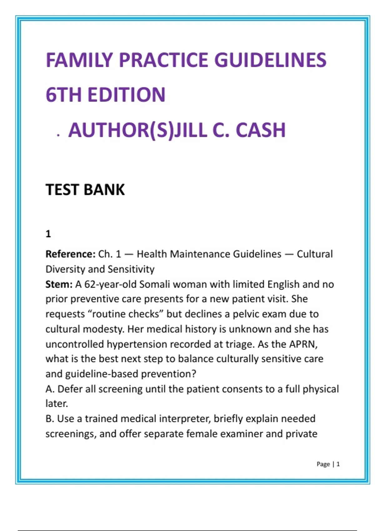 Family Practice Guidelines 6th Ed 2025 Test Bank | 50 MCQs/Chapter | FNP & AGNP Primary Care Exam Prep with Verified Answers 2) SEO Product Description (200–300 words) Master the 2025 Family Practice Guidelines with the most complete, high-accuracy test bank available for NP and PA learners. This Family Practice Guidelines, 6th Edition (Jill C. Cash) — Complete Test Bank delivers 50 clinically precise MCQs per chapter, each crafted to mirror real-world primary care encounters and the decision-making demanded on FNP, AGNP, and PA exams. Designed by expert item writers and clinicians, this digital resource transforms guideline study into targeted, exam-ready mastery. Every question includes verified answers with evidence-based rationales, strengthening your skills in diagnostic reasoning, guideline-based management, health maintenance, acute and chronic condition assessment, women’s health, pediatrics, geriatrics, and behavioral health. Learners consistently report 90–100% performance improvement using this test bank due to its focus on high-yield clinical synthesis, priority setting, and advanced assessment interpretation—exactly what NP and PA programs require. Whether you’re preparing for clinical rotations, end-of-program exams, or national certification boards, this is the most comprehensive and 2025-aligned Family Practice Guidelines study tool available. What’s Included Full 2025 edition test bank — all chapters covered 50 exam-quality MCQs per chapter Verified answers + evidence-based rationales Diagnostic reasoning & differential diagnosis questions Primary care management & guideline-application items NP- and PA-style clinical scenarios Covers preventive care, chronic disease management, OB/GYN, pediatrics, geriatrics, urgent care, and mental health Perfect for FNP, AGNP, PA, medical students, and primary care clinicians Study smarter. Learn faster. Master primary care with confidence. 3) 8 High-Value SEO Keywords Family Practice Guidelines test bank FNP 2025 questions Primary care NP exam prep AGNP test bank 2025 NP clinical guideline questions PA primary care test bank Family Practice MCQs with rationales Primary care differential diagnosis questions 4) 10 Hashtags #FNPExamPrep #PrimaryCareTestBank #FamilyPracticeGuidelines #AGNPLearning #PAExamPrep #NursingSchoolSuccess #ClinicalReasoning #NPBoardPrep #MedicalMCQs #StudySmarter