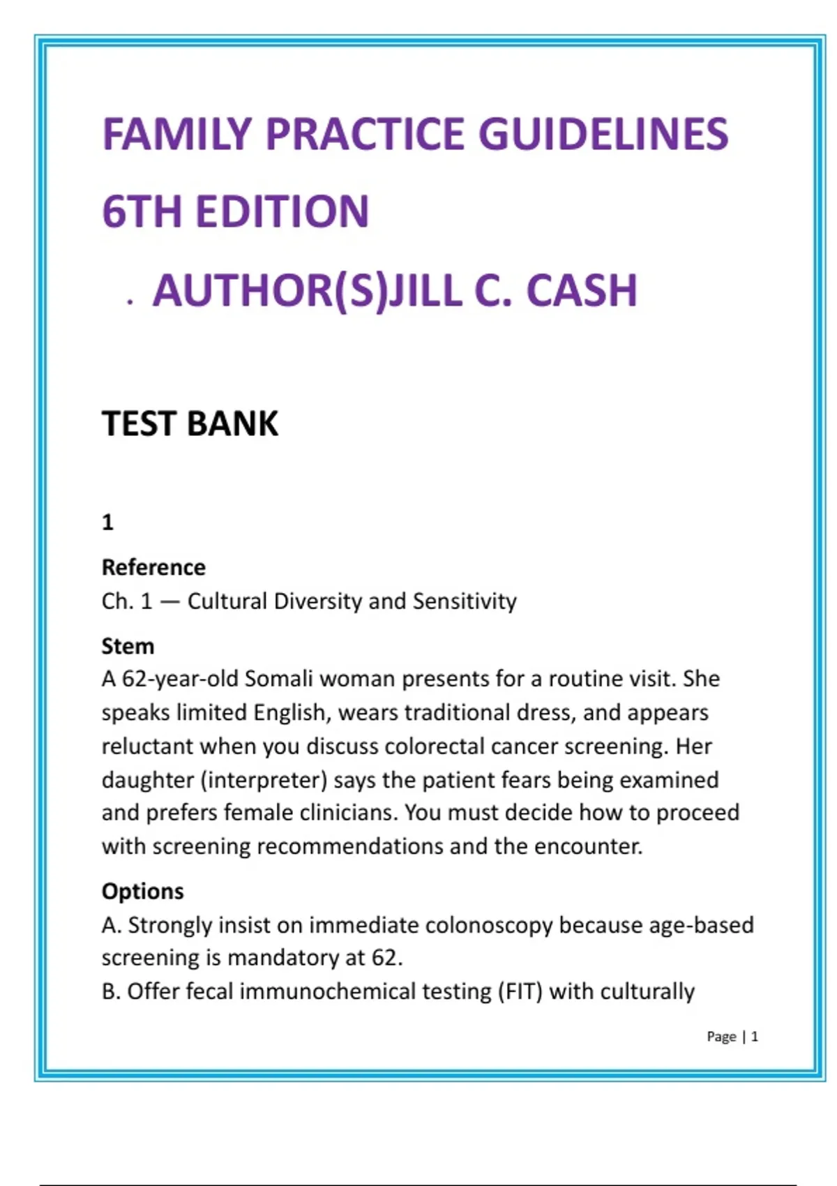 Family Practice Guidelines 6th Edition Test Bank — 2025 FNP/PA Prep | 50 MCQs Per Chapter • Verified Answers & Rationales 2) SEO Product Description (200–300 words) Master primary care with the only complete, chapter-by-chapter test bank built exclusively from Family Practice Guidelines — 6th Edition (Jill C. Cash), 2025. This digital study system delivers 50 high-quality MCQs per chapter with verified answers and clinical rationales engineered for NP, PA, and primary-care learners. Designed by clinician-educators and item-writers, questions emphasize differential diagnosis, guideline-based management, red-flag detection, and advanced clinical reasoning — exactly what FNP/AGNP and PA boards test. Use this test bank to accelerate exam readiness, sharpen diagnostic thinking, and translate evidence-based guidelines into confident clinical decisions. Learners report dramatic mastery gains: study modules structured for deliberate practice, targeted remediation, and near-exam fidelity — engineered to support 90–100% improvement in topic mastery when used with a disciplined study plan. Key benefits: score-boosting, exam-aligned, time-efficient, and clinically accurate. Ideal for FNP/AGNP programs, PA courses, clinical practicums, board prep, and clinic-based review. Features at a glance: • Full 2025 chapter-by-chapter coverage (all chapters) • 50 MCQs per chapter — NP/PA-style clinical application items • Verified correct answers with evidence-based rationales • Differential diagnosis & management reasoning items • Downloadable digital format — printable & searchable • Mapping to primary care guideline principles for rapid remediation Family Practice Guidelines is a nationally recognized primary-care standard — this test bank turns that standard into exam success. 3) 8 High-Value SEO Keywords Family Practice Guidelines test bank 2025 FNP test bank primary care NP questions verified answers rationales FNP board review 2025 primary care MCQs clinical guideline exam prep PA exam practice questions 4) 10 Hashtags #FamilyPracticeTestBank #FNP2025 #PrimaryCareMCQs #VerifiedRationales #BoardPrepNP #PAExamPrep #ClinicalGuidelineReview #50MCQsPerChapter #EvidenceBasedNP #PrimaryCareStudyPack