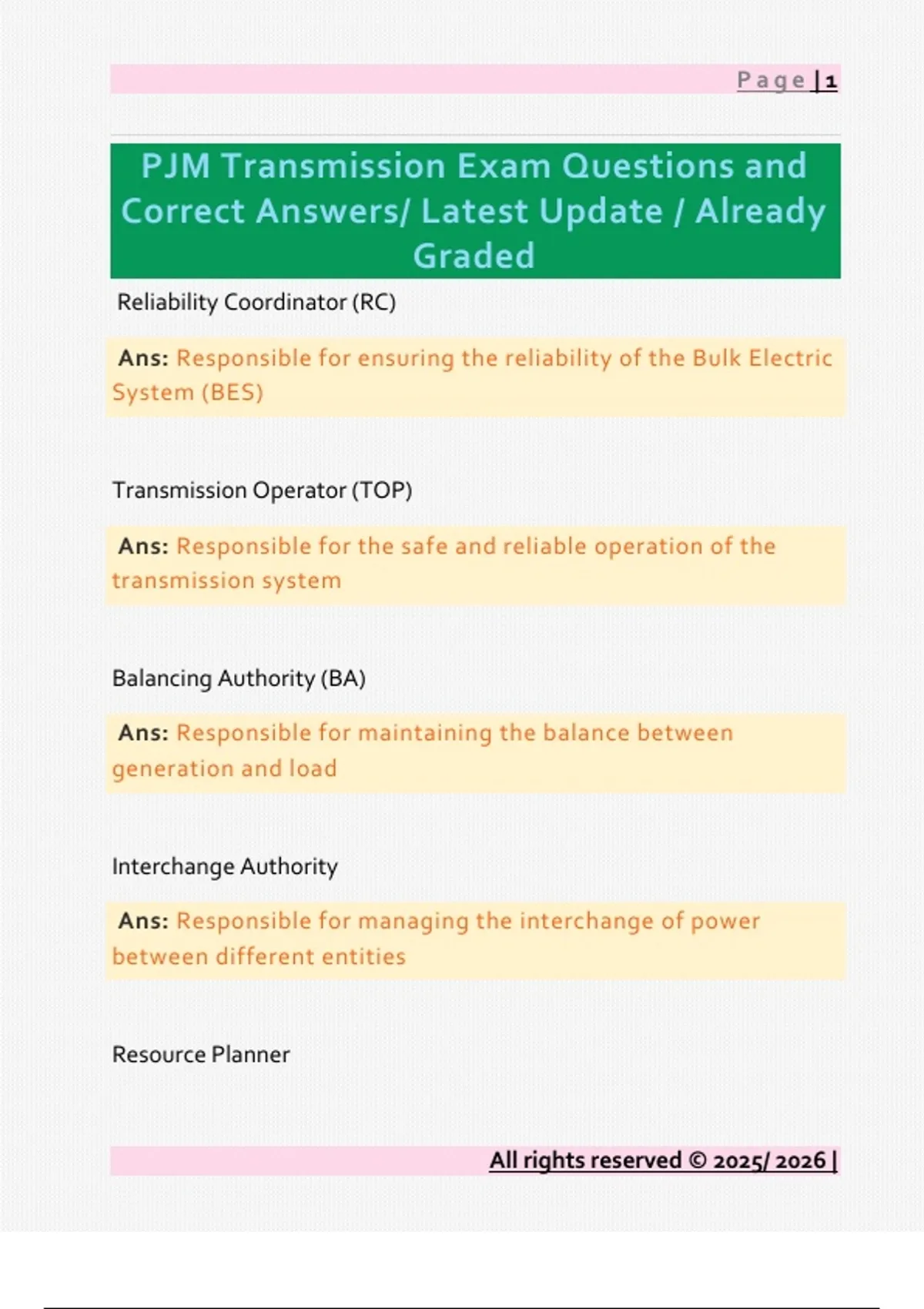 PJM Transmission Exam Questions and Correct Answers/ Latest Update / Already Graded