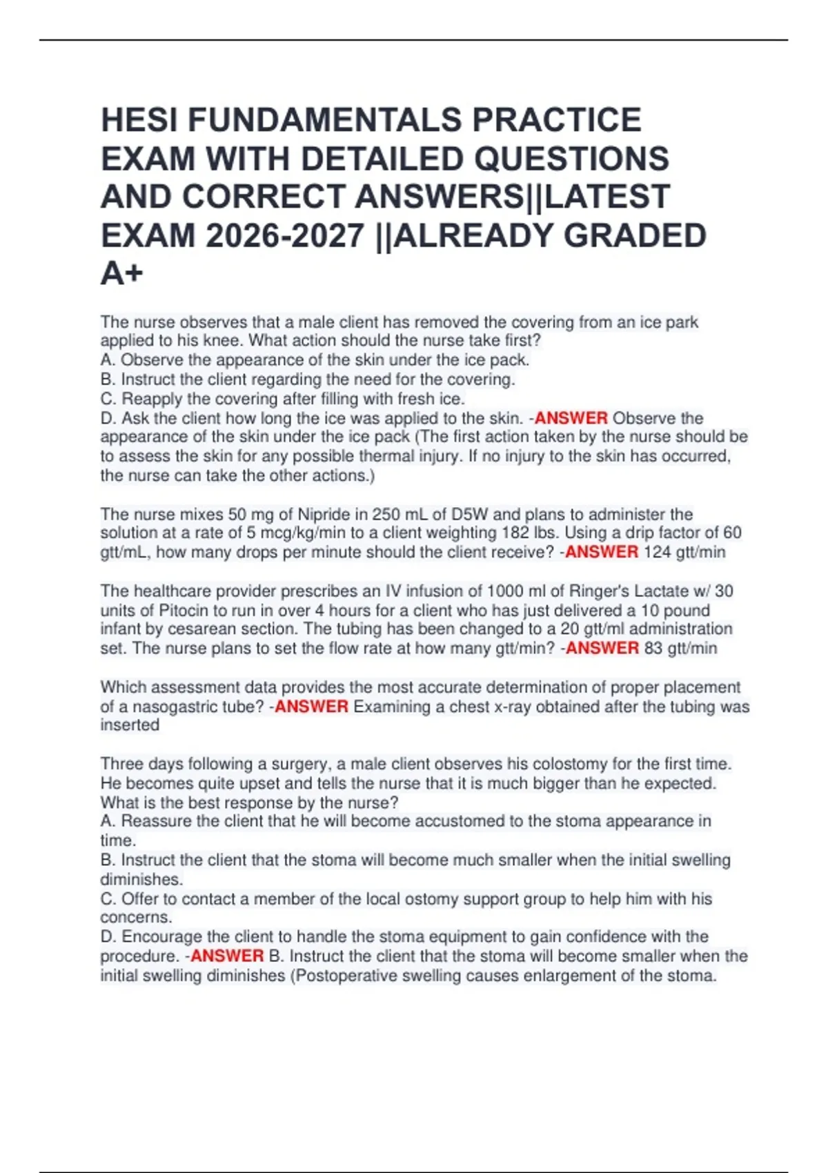 HESI FUNDAMENTALS PRACTICE EXAM WITH DETAILED QUESTIONS AND CORRECT ANSWERS||LATEST EXAM ||ALREADY GRADED A+