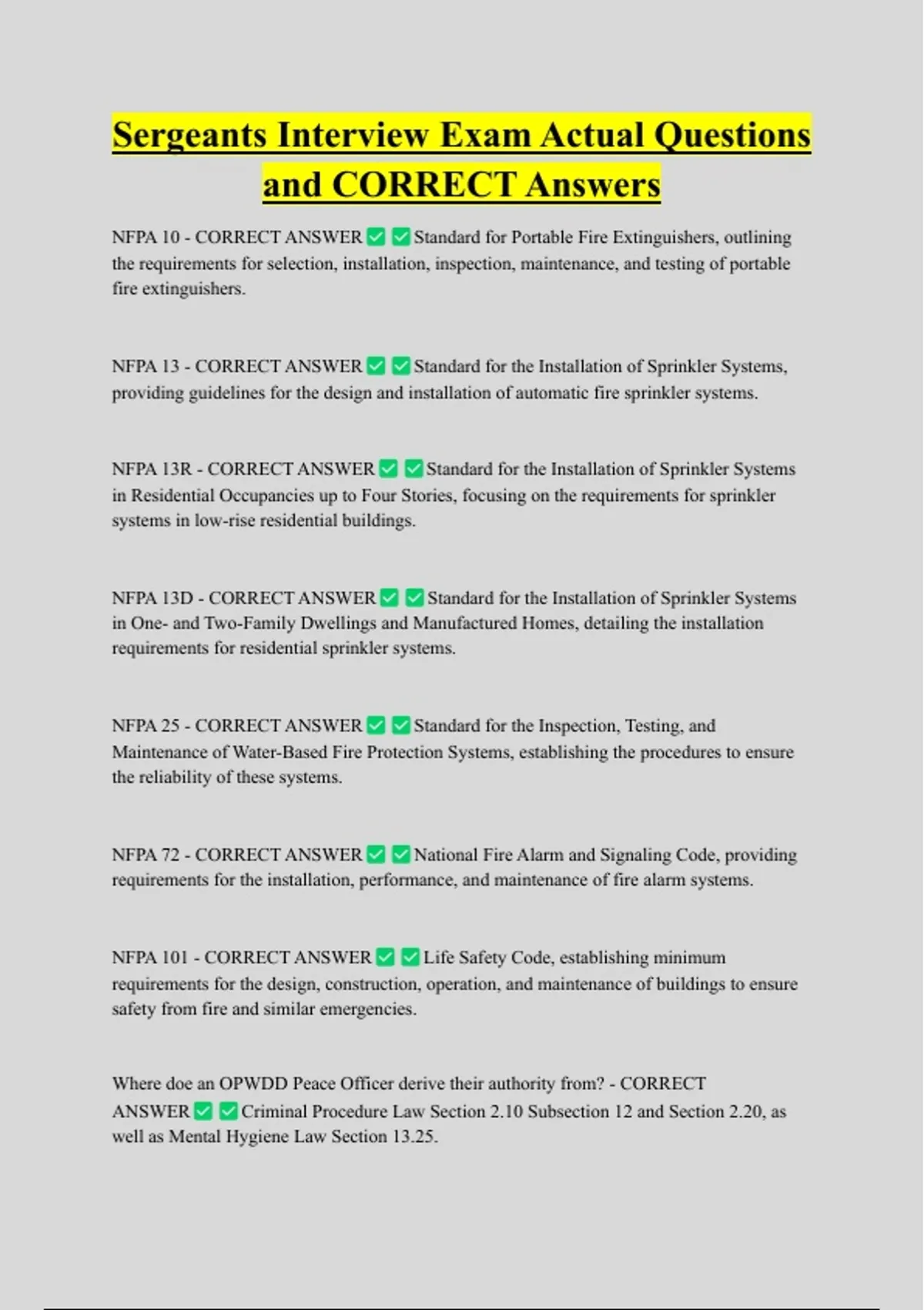 NFPA 13 - CORRECT ANSWER Standard for the Installation of Sprinkler Systems,