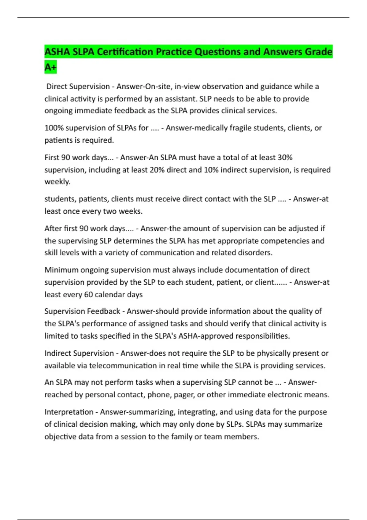 ASHA SLPA Certification Practice Questions and Answers Grade