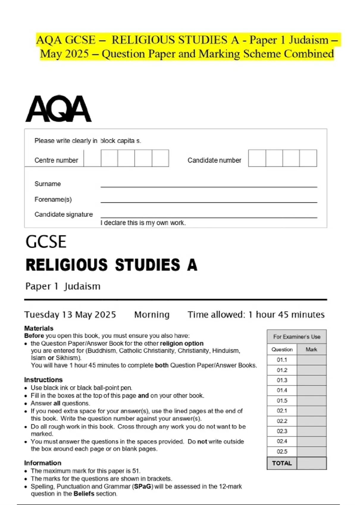 AQA GCSE - RELIGIOUS STUDIES A - Paper 1 Judaism May 2025 - Question Paper and Marking Scheme Combined