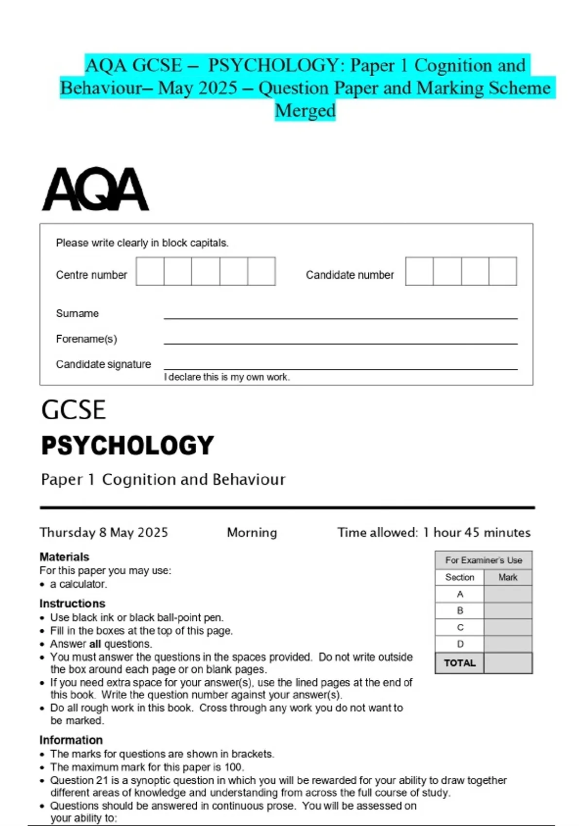 AQA GCSE – PSYCHOLOGY: Paper 1 Cognition and Behaviour- May 2025 - Question Paper and Marking Scheme Merged