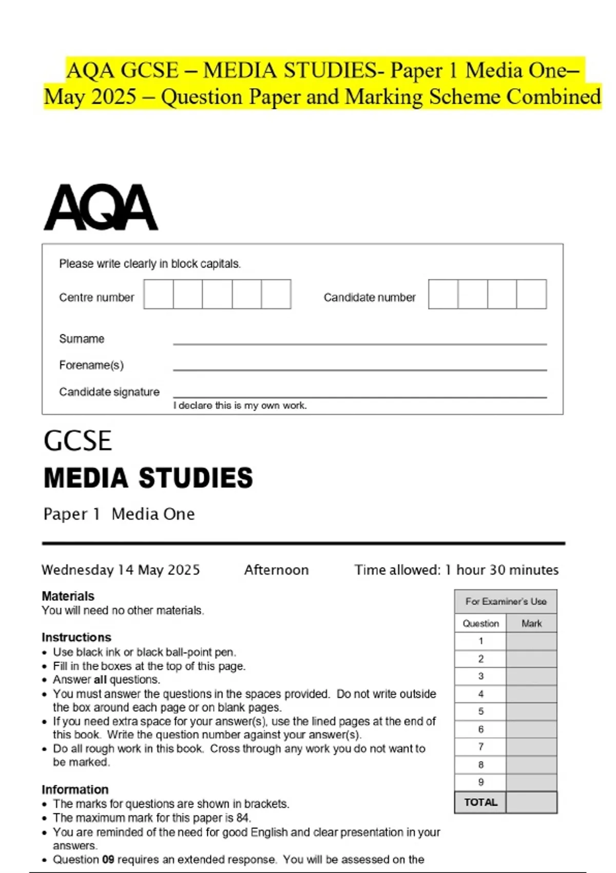 AQA GCSE - MEDIA STUDIES- Paper 1 Media OneMay 2025 - Question Paper and Marking Scheme Combined