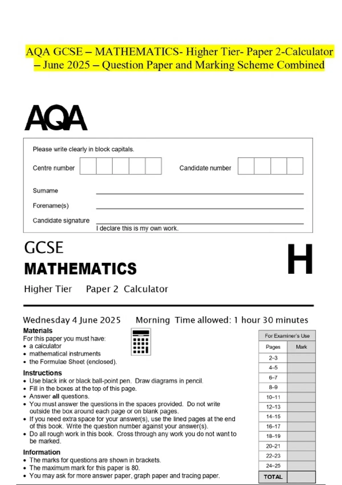 AQA GCSE - MATHEMATICS- Higher Tier- Paper 2-Calculator - June 2025 - Question Paper and Marking Scheme Combined