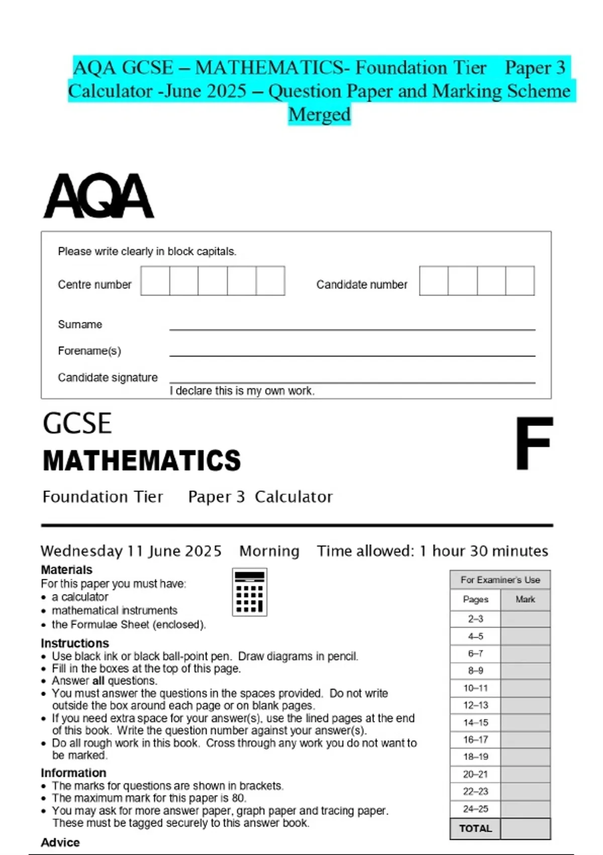 AQA GCSE - MATHEMATICS- Foundation Tier Paper 3 Calculator -June 2025 - Question Paper and Marking Scheme Merged