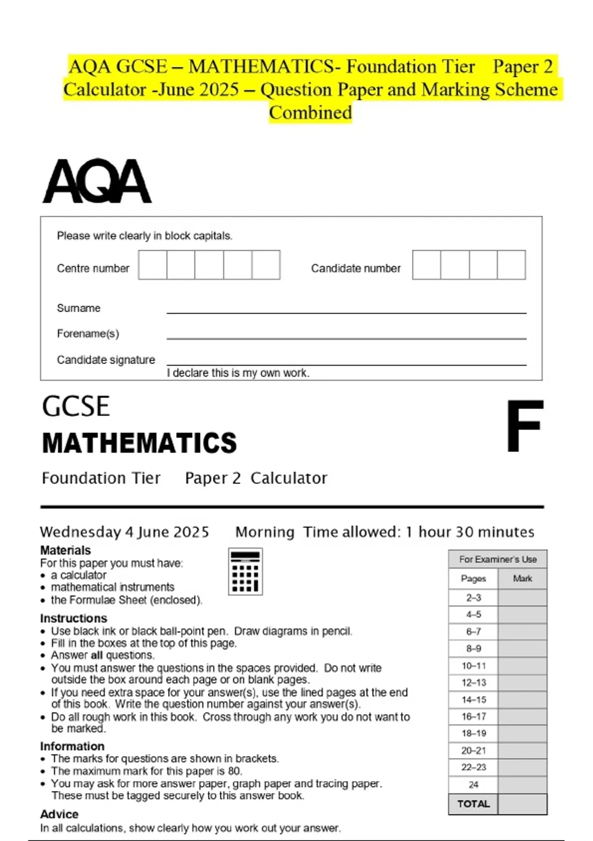 AQA GCSE – MATHEMATICS- Foundation Tier Paper 2 Calculator -June 2025 – Question Paper and Marking Scheme Combined