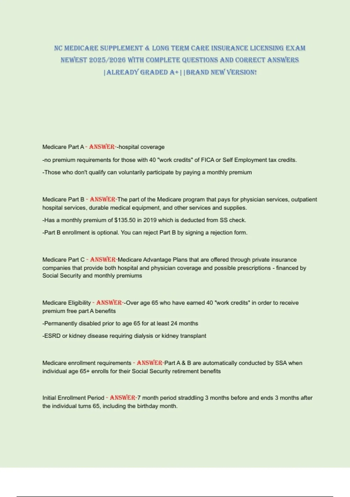 Medicare Eligibility - aNSwer--Over age 65 who have earned 40 "work credits" in order to receive