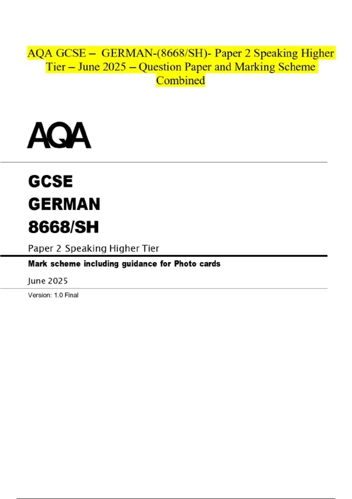AQA GCSE - GERMAN-(8668/SH)- Paper 2 Speaking Higher Tier - June 2025 – Question Paper and Marking Scheme Combined