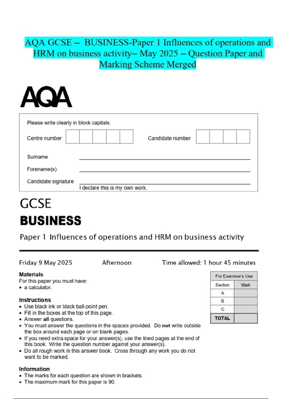 AQA GCSE - BUSINESS-Paper 1 Influences of operations and HRM on business activity- May 2025 - Question Paper and Marking Scheme Merged