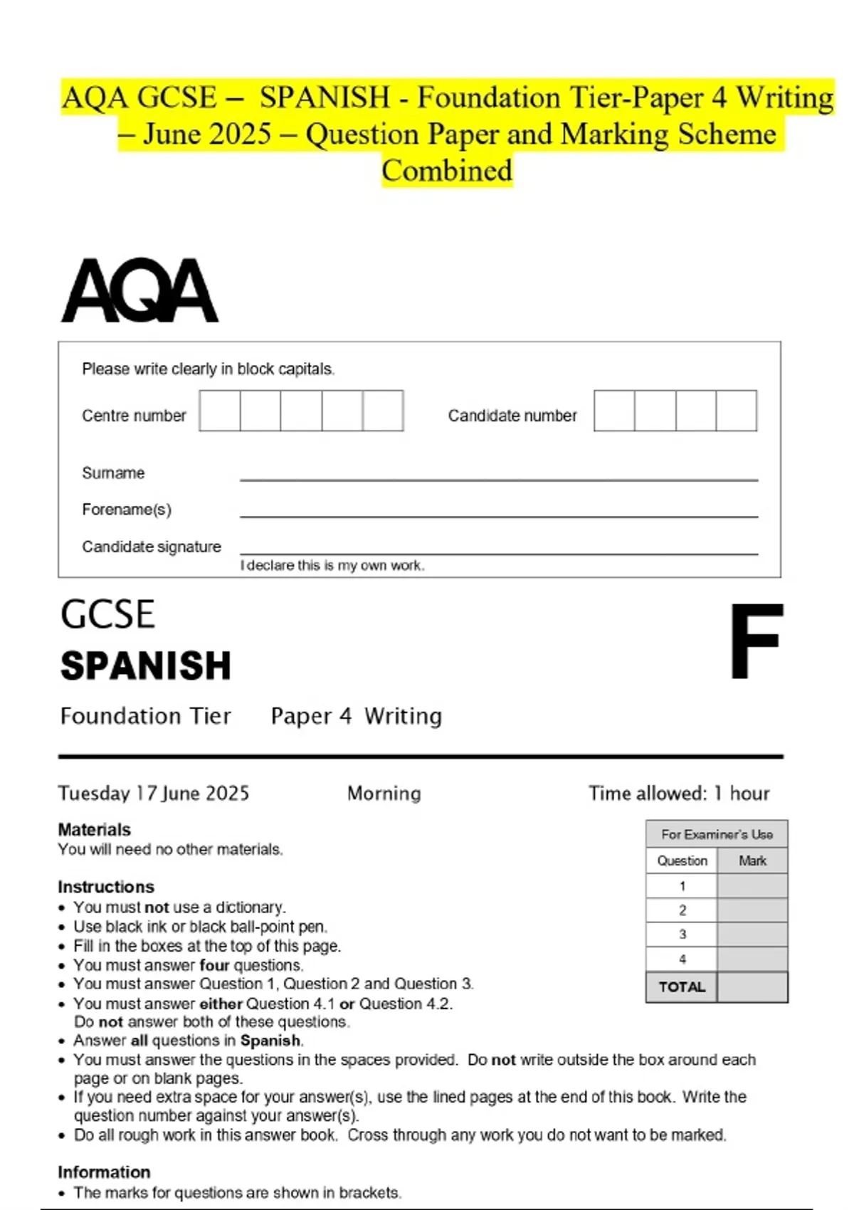 AQA GCSE - SPANISH - Foundation Tier-Paper 4 Writing - June 2025 - Question Paper and Marking Scheme Combined