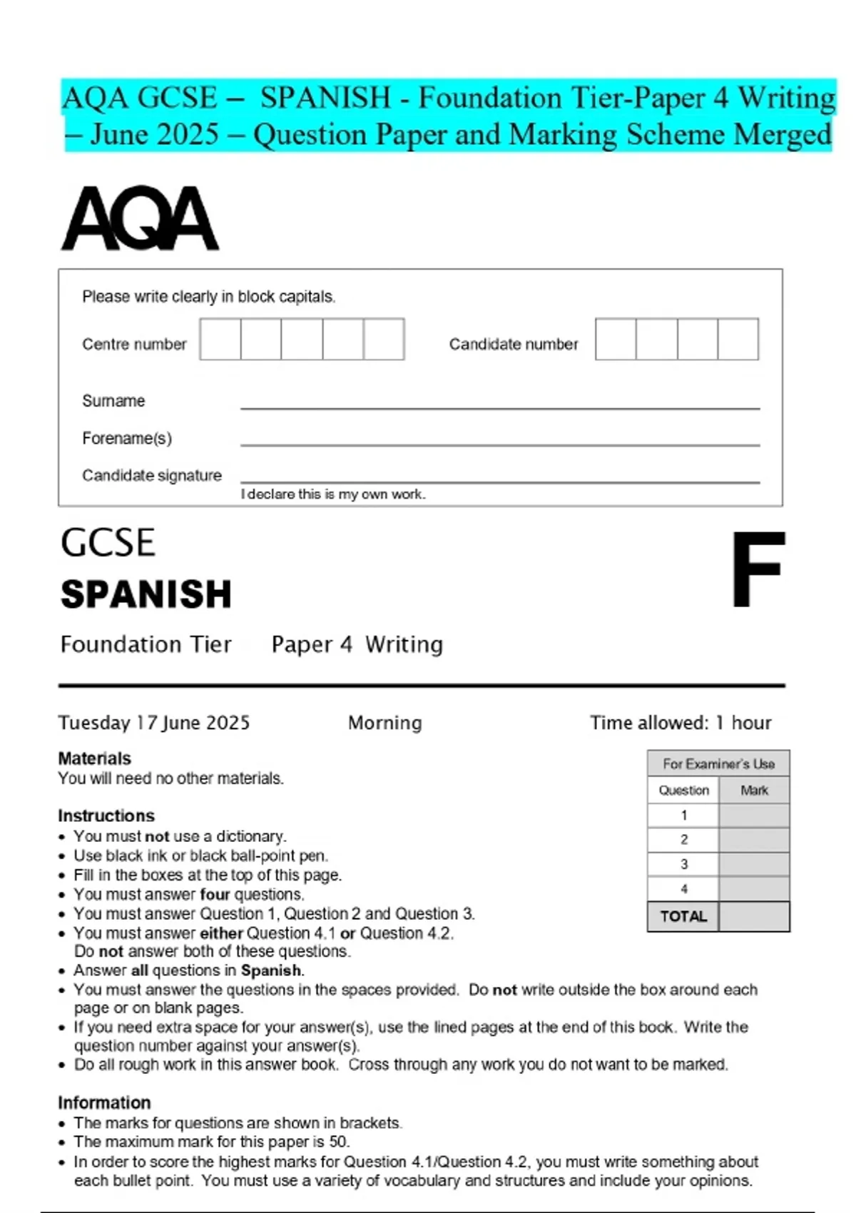 AQA GCSE - SPANISH - Foundation Tier-Paper 4 Writing - June 2025 - Question Paper and Marking Scheme Merged