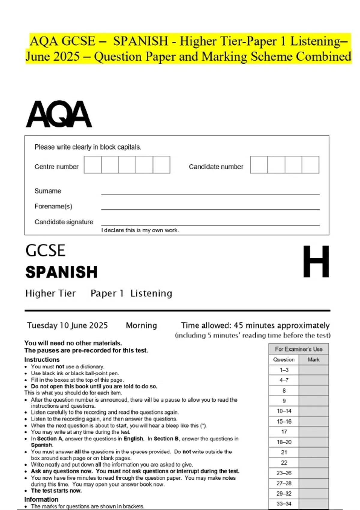 AQA GCSE - SPANISH - Higher Tier-Paper 1 ListeningJune 2025 – Question Paper and Marking Scheme Combined