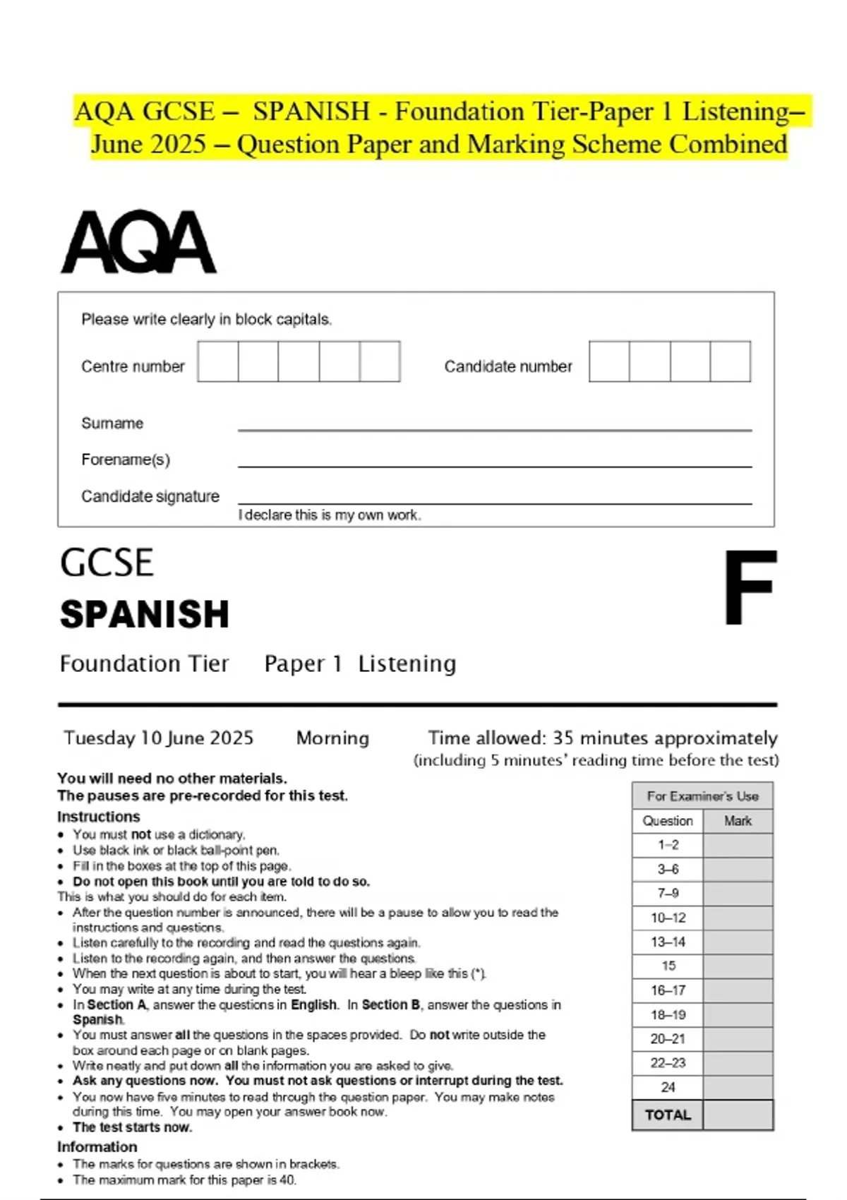 AQA GCSE - SPANISH - Foundation Tier-Paper 1 ListeningJune 2025 - Question Paper and Marking Scheme Combined