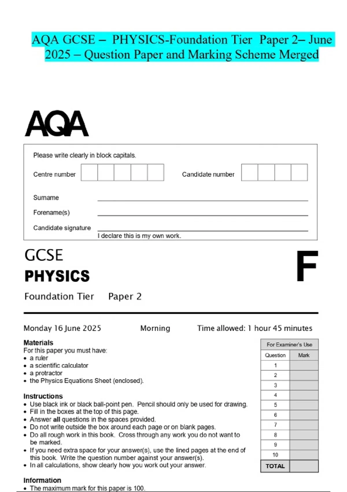 AQA GCSE - PHYSICS-Foundation Tier Paper 2- June 2025- Question Paper and Marking Scheme Merged