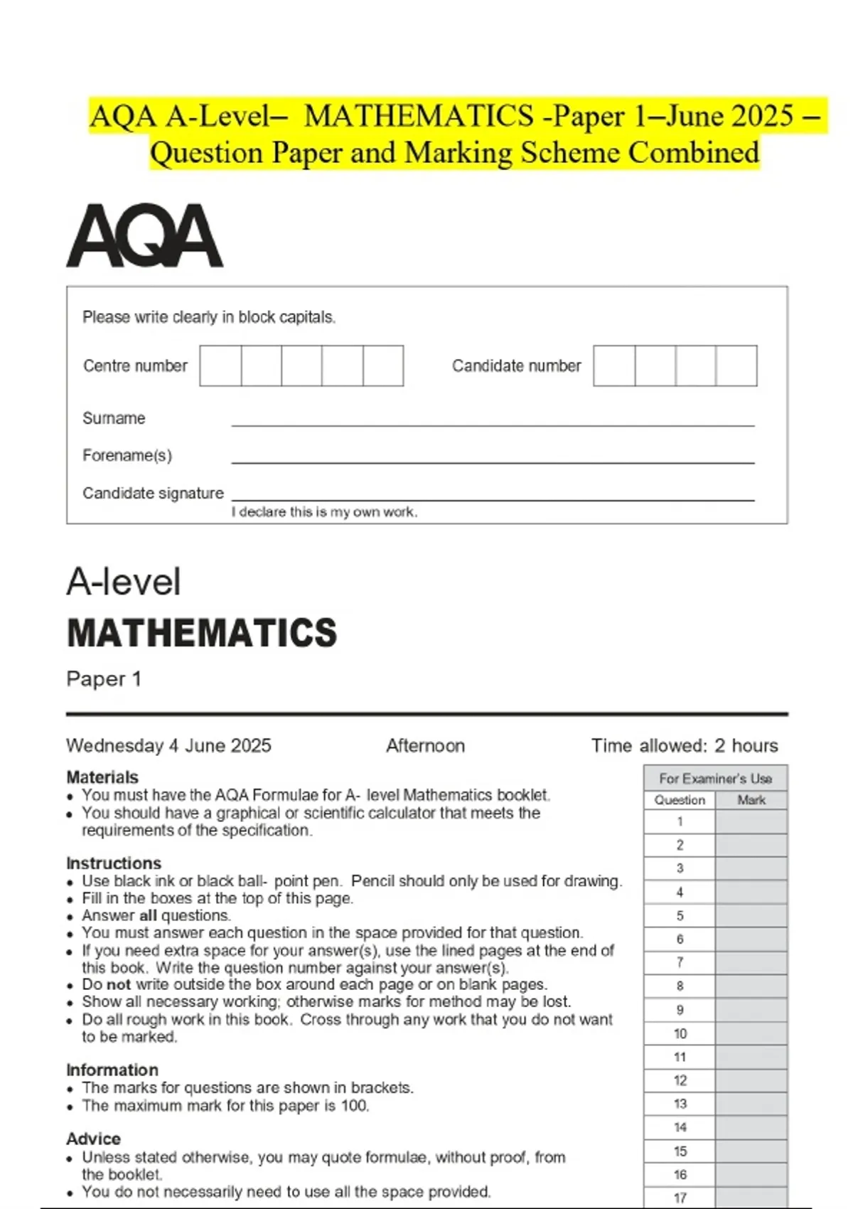 AQA A-Level- MATHEMATICS -Paper 1-June 2025 Question Paper and Marking Scheme Combined