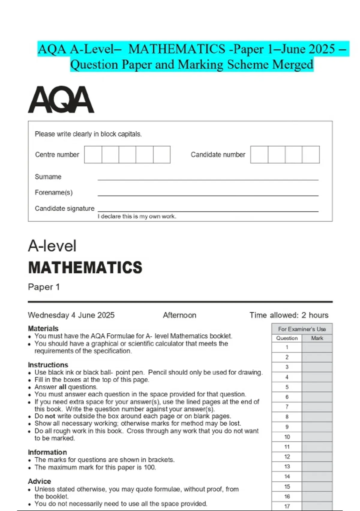AQA A-Level- MATHEMATICS -Paper 1-June 2025 - Question Paper and Marking Scheme Merged