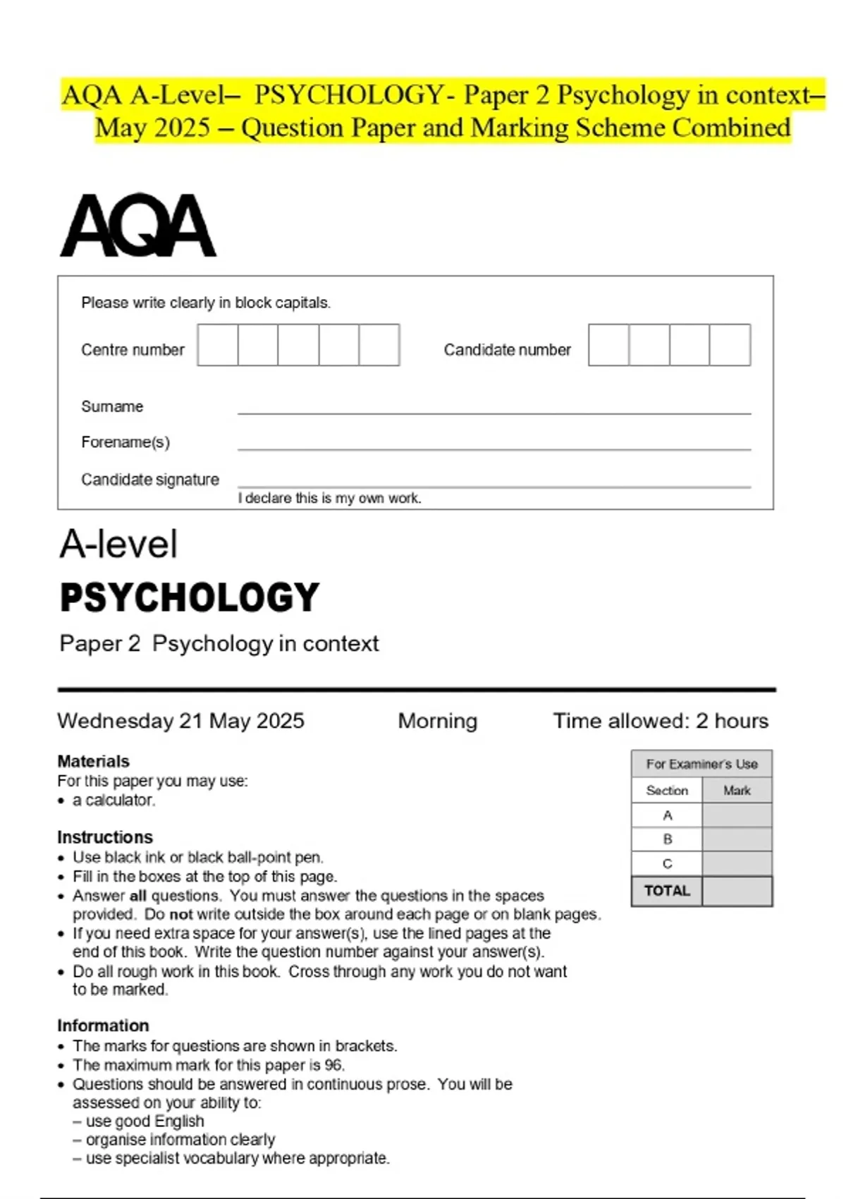 AQA A-Level- PSYCHOLOGY- Paper 2 Psychology in contextMay 2025 - Question Paper and Marking Scheme Combined
