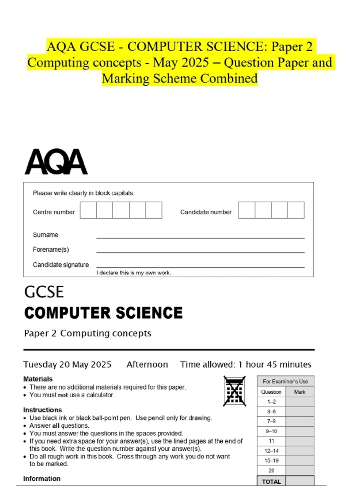 AQA GCSE - COMPUTER SCIENCE: Paper 2 Computing concepts - May 2025 - Question Paper and Marking Scheme Combined