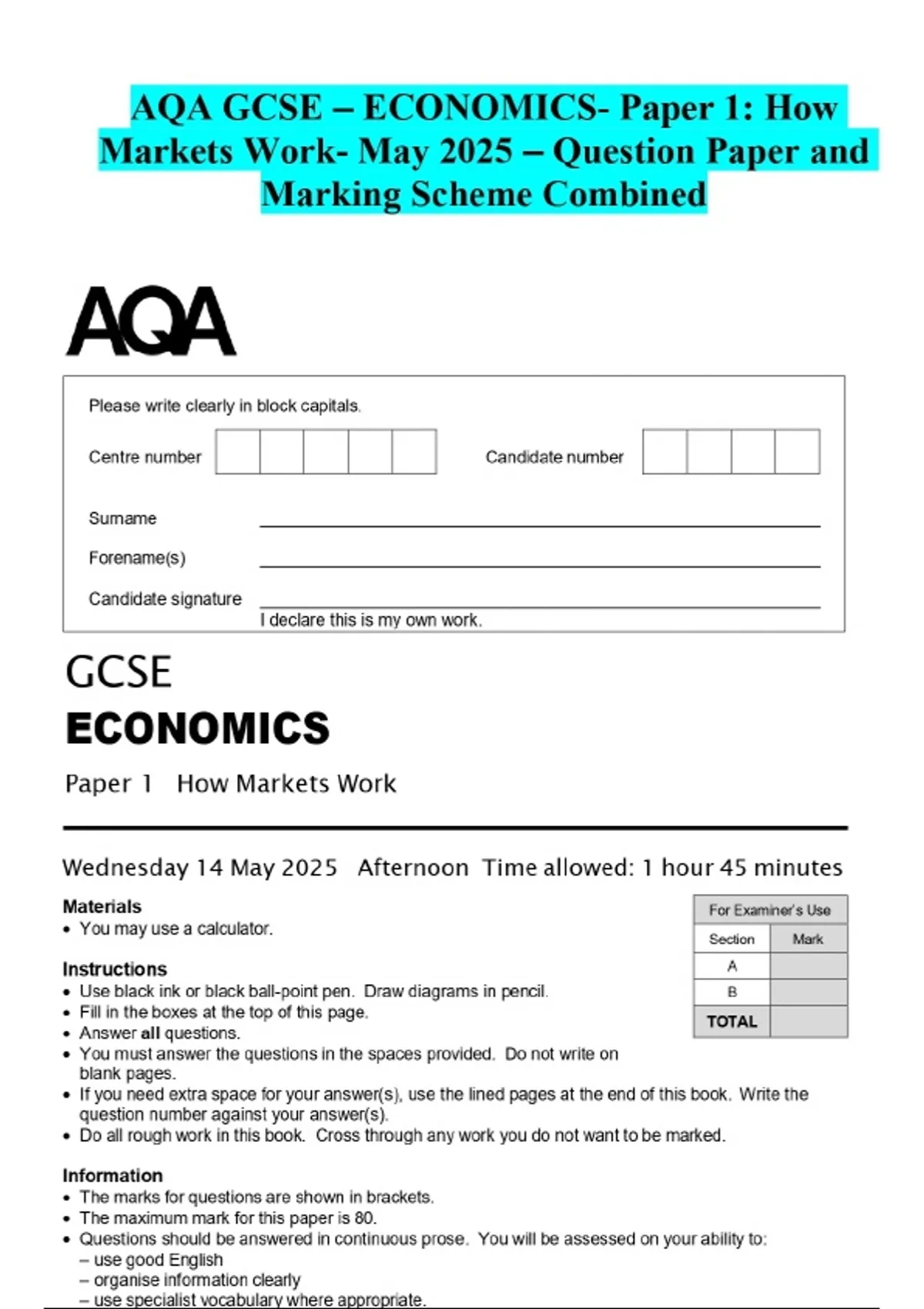 AQA GCSE – ECONOMICS- Paper 1: How Markets Work- May 2025 – Question Paper and Marking Scheme Combined