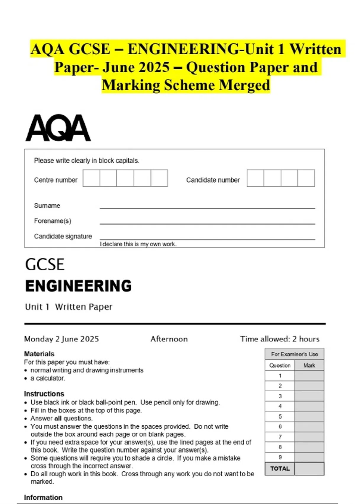 AQA GCSE – ENGINEERING-Unit 1 Written Paper- June 2025 - Question Paper and Marking Scheme Merged
