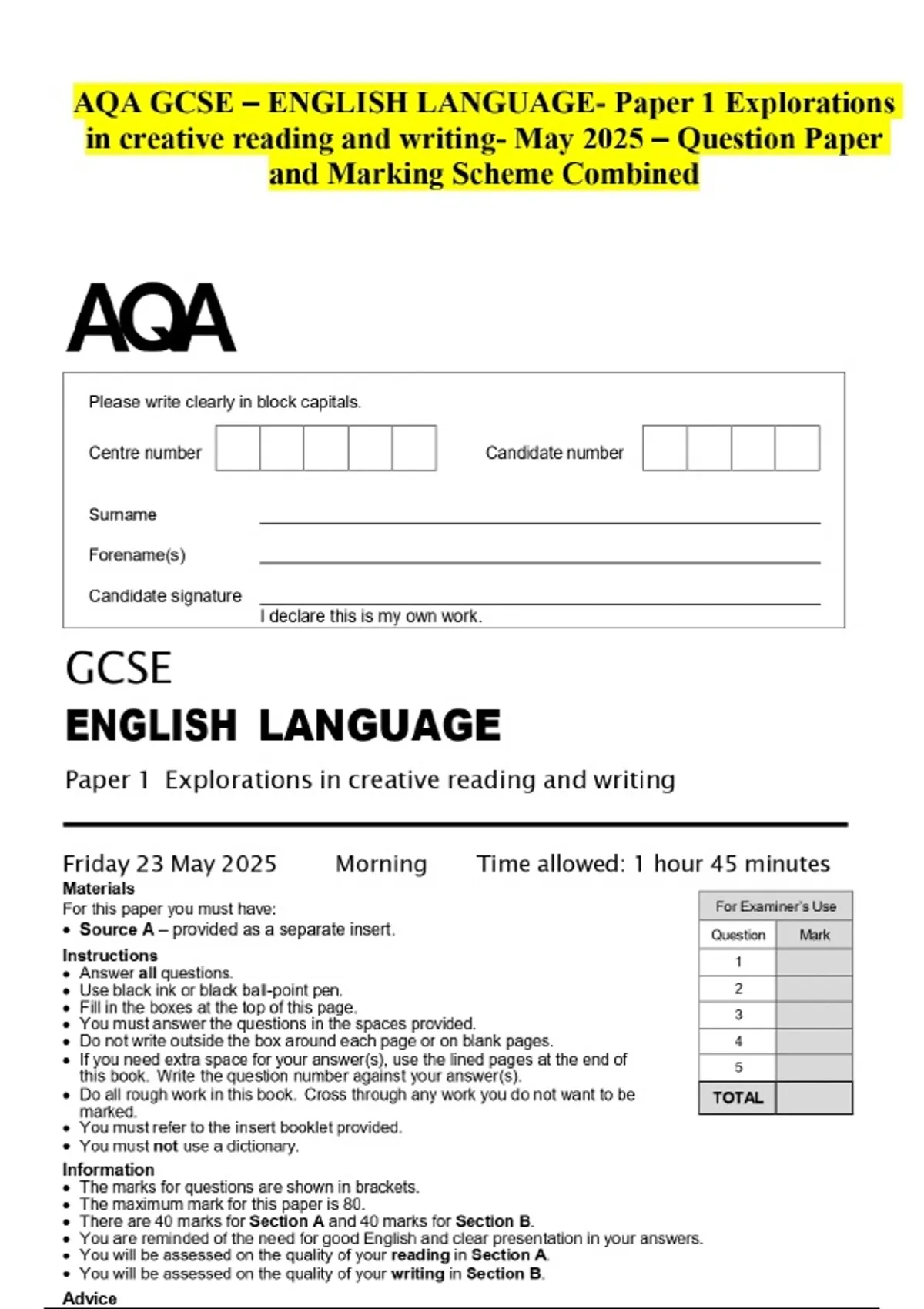 AQA GCSE – ENGLISH LANGUAGE- Paper 1 Explorations in creative reading and writing- May 2025 - Question Paper and Marking Scheme Combined