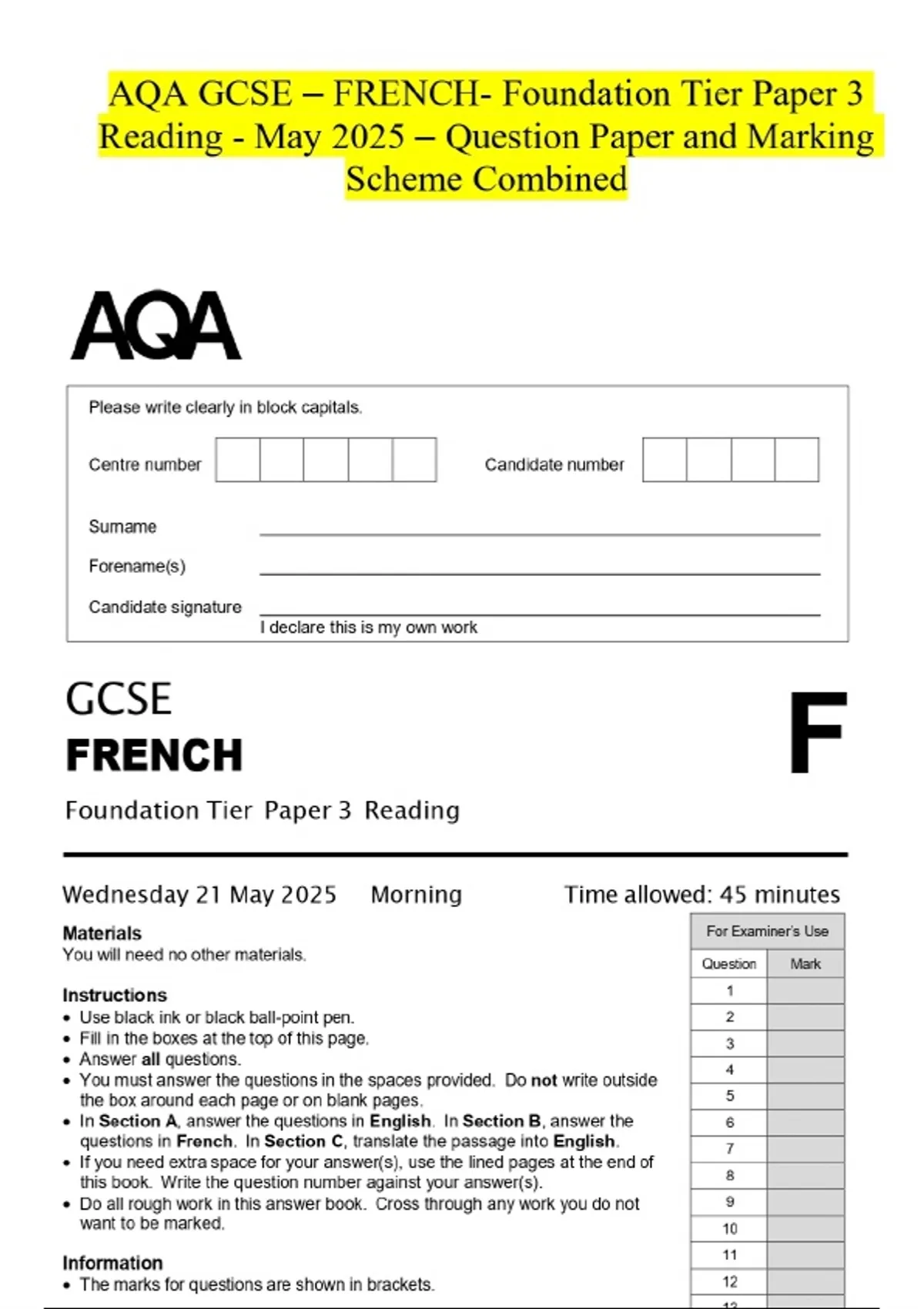 AQA GCSE - FRENCH- Foundation Tier Paper 3 Reading - May 2025 - Question Paper and Marking Scheme Combined