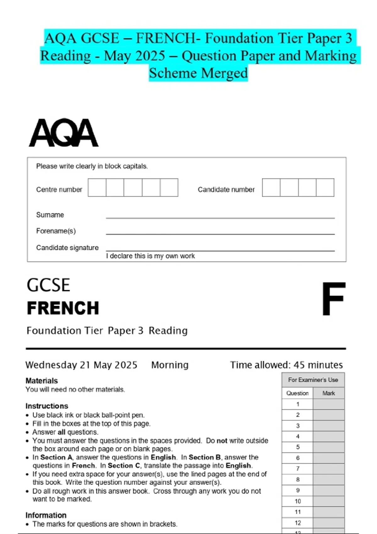 QA GCSE - FRENCH- Foundation Tier Paper 3 Reading - May 2025 - Question Paper and Marking Scheme Merged