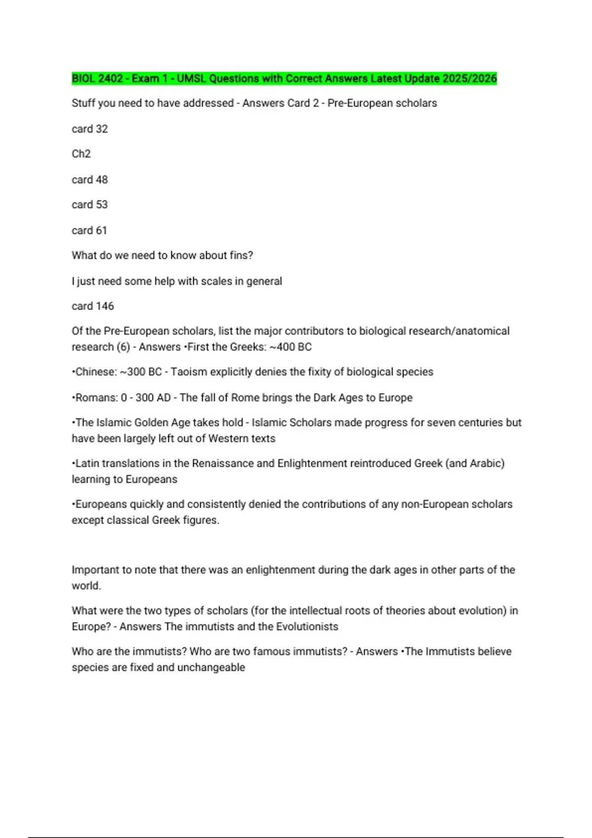 BIOL 2402 - Exam 1 - UMSL Questions with Correct Answers Latest Update 2025/2026 Stuff you need to have addressed - Answers Card 2 - Pre-European scholars card 32 Ch2 card 48 card 53 card 61 What do we need to know about fins? I just need some help with scales in general card 146 Of the Pre-European scholars, list the major contributors to biological research/anatomical research (6) - Answers •First the Greeks: ~400 BC •Chinese: ~300 BC - Taoism explicitly denies the fixity of biological species •Romans: 0 - 300 AD - The fall of Rome brings the Dark Ages to Europe •The Islamic Golden Age takes hold - Islamic Scholars made progress for seven centuries but have been largely left out of Western texts •Latin translations in the Renaissance and Enlightenment reintroduced Greek (and Arabic) learning to Europeans •Europeans quickly and consistently denied the contributions of any non-European scholars except classical Greek figures. Important to note that there was an enlightenment during the dark ages in other parts of the world. What were the two types of scholars (for the intellectual roots of theories about evolution) in Europe? - Answers The immutists and the Evolutionists Who are the immutists? Who are two famous immutists? - Answers •The Immutists believe species are fixed and unchangeable •Carolus Linnaeus (father of taxonomy) •Rev. John Ray and the Naturalists - fantastical creatures are manifestations of the divine mind Who are the evolutionists? Who are is our most famous evolutionist, and what do think? - Answers •Jean-Baptiste de Lamarck's main points: •Spontaneous generation - living matter comes from non living matter, which is wrong. •Evolution from lowest to perfect (read: humans) •Inheritance of acquired characteristics (passing on laser hair removal to your kids) What is the problem with acquired characteristics? - Answers •The needs of an individual are not encoded in the genome of germ cells •Therefore they can't be inherited What is the problem with the Ladder of Progress? - Answers 1.) To evolution, there is only now. The idea of a direction or concept of the future or increasing complexity is wrong. 2.)The idea that primitive/basal organisms are less evolved or less perfect assumes that selection favors organisms that are pleasing to humans rather than best adapted to their time and place. Who are credited with formalizing the theory of Evolution by Natural Selection? - Answers Charles Darwin & Alfred R. Wallace The Modern Synthesis - Answers The later combination of Mendelian genetics and Darwinian evolution What were the two main arguments of the controversy surrounding theory of evolution by natural selection? - Answers 1.) Contemporaries thought Earth was not old enough to have allowed for the diversity of life at the pace Darwin suggested 1.) Blending inheritance was the prevailing thought of the time, this predicts a reduction in variation through successive generations of blending Georges Cuvier (3) - Answers •An immutist who believed that organisms should be understood as similar to machines, composed of various interlocking functional groups. (head of a dog body of tiger tail of a lion) •Catastrophism (what he is most known for, that all features of the earth result from catastrophe) •Scientific Racism - Thought Europeans were superiors to other races. Richard Owen - Answers •Also an immutist •Troubled by obvious homologies among groups. •Thus, he proposed that all living groups were composed of members constructed around the same basic body plan or archetype, but not that they evolved. •Also rumored to be a very bad man: •Upon the death of his nemesis Gideon Mantell, Owen had a "section of his spine removed, pickled and stored on a shelf at the Royal College of Surgeons of England. •It remained there until 1969 when it was destroyed due to lack of space." What are the three Main Morphological Concepts? (SSS) - Answers 1. Similarity 2. Symmetry 3. Segmentation Homology - Answers Features that are shared as a result of common ancestry
