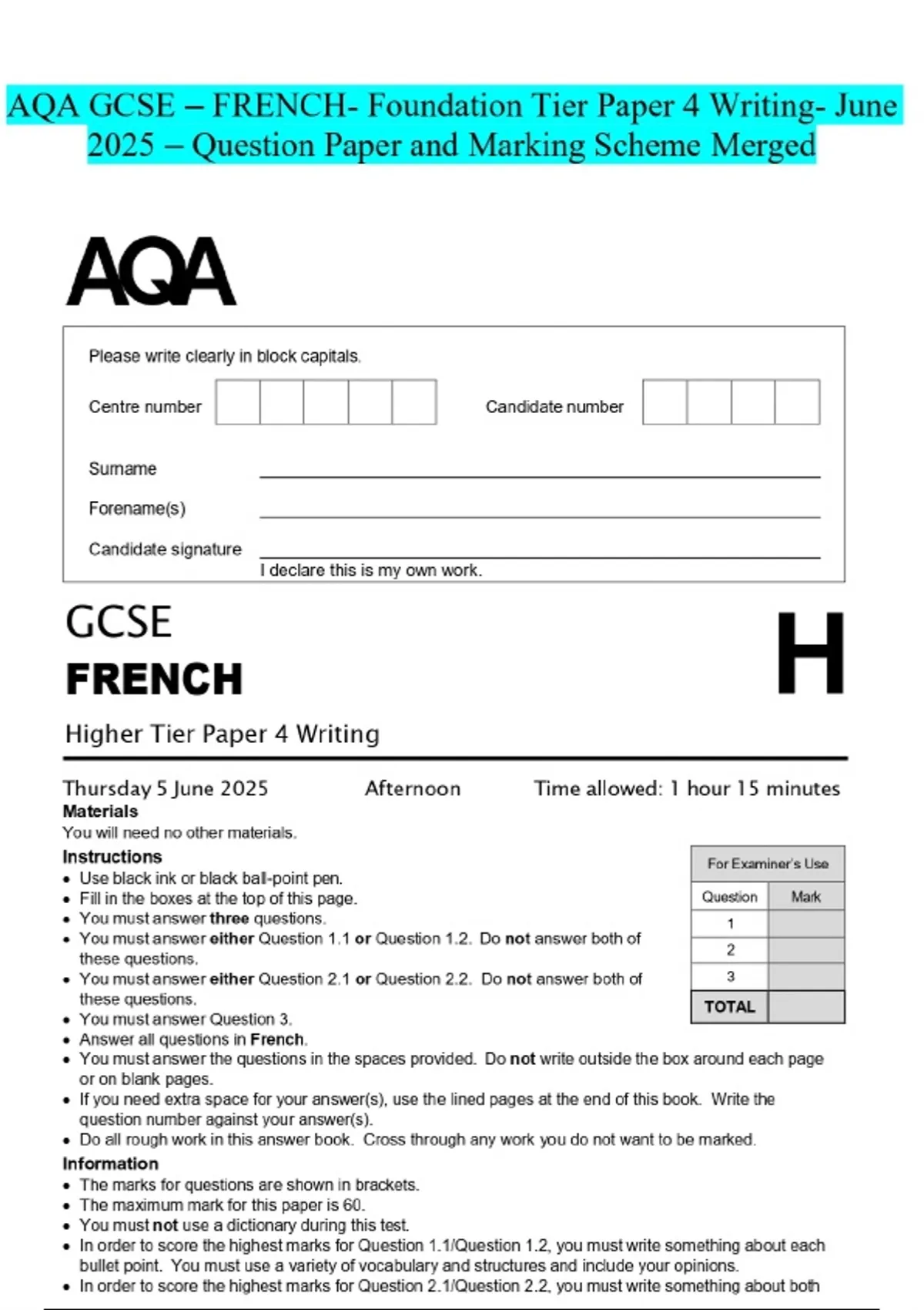 AQA GCSE - FRENCH- Foundation Tier Paper 4 Writing- June 2025 - Question Paper and Marking Scheme Merged
