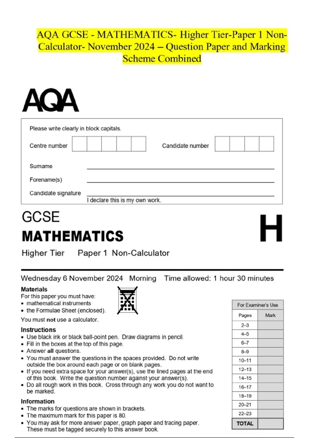 AQA GCSE - MATHEMATICS- Higher Tier-Paper 1 NonCalculator- November 2024 – Question Paper and Marking Scheme Combined