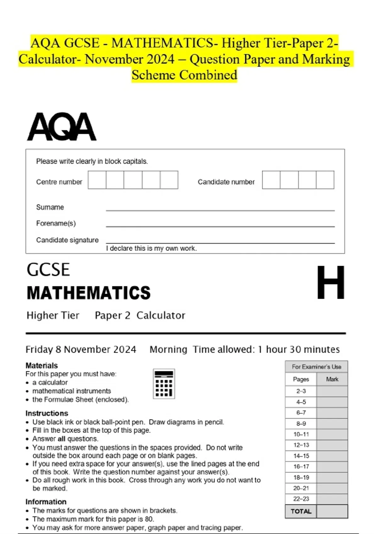 AQA GCSE - MATHEMATICS- Higher Tier-Paper 2- Calculator- November 2024 - Question Paper and Marking Scheme Combined