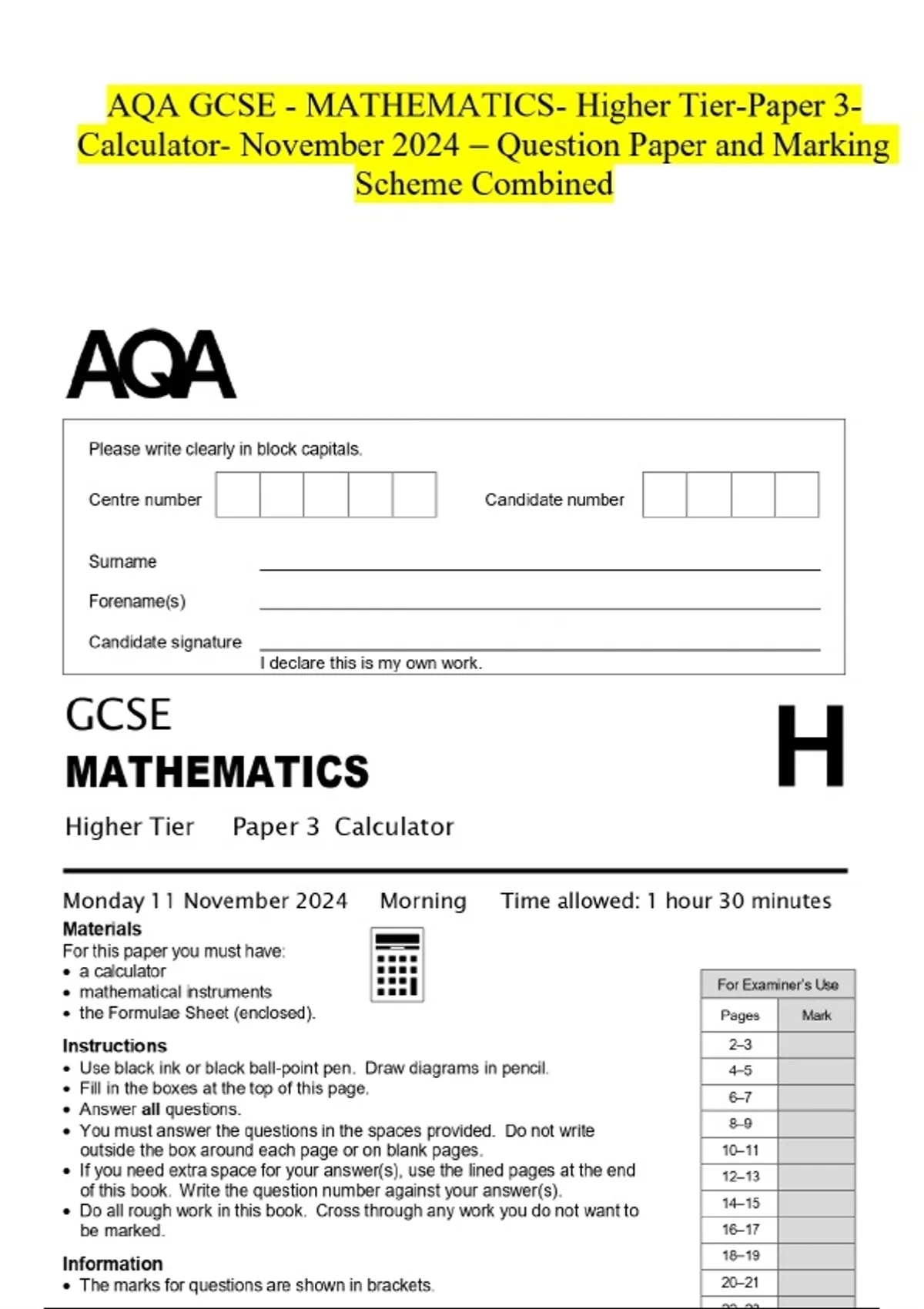 AQA GCSE - MATHEMATICS- Higher Tier-Paper 3- Calculator- November 2024 - Question Paper and Marking Scheme Combined