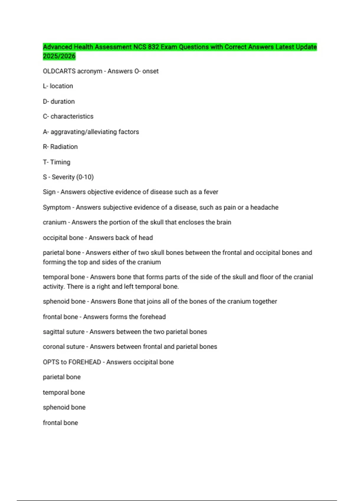Advanced Health Assessment NCS 832 Exam Questions with Correct Answers Latest Update 2025/2026 OLDCARTS acronym - Answers O- onset L- location D- duration C- characteristics A- aggravating/alleviating factors R- Radiation T- Timing S - Severity (0-10) Sign - Answers objective evidence of disease such as a fever Symptom - Answers subjective evidence of a disease, such as pain or a headache cranium - Answers the portion of the skull that encloses the brain occipital bone - Answers back of head parietal bone - Answers either of two skull bones between the frontal and occipital bones and forming the top and sides of the cranium temporal bone - Answers bone that forms parts of the side of the skull and floor of the cranial activity. There is a right and left temporal bone. sphenoid bone - Answers Bone that joins all of the bones of the cranium together frontal bone - Answers forms the forehead sagittal suture - Answers between the two parietal bones coronal suture - Answers between frontal and parietal bones OPTS to FOREHEAD - Answers occipital bone parietal bone temporal bone sphenoid bone frontal bone zygomatic bone - Answers cheek bone zygomatic arch - Answers origin of masseter maxilla - Answers upper jaw mandible - Answers lower jaw Tempero-Mandibular Joint (TMJ) - Answers palpebral fissure - Answers open space between eyelids nasolabial folds - Answers the creases extending from the nose to each corner of the mouth perioral - Answers surrounding the mouth philtrum - Answers Rectangular area from under the nose to the midline of the upper lip vermillion border - Answers area where the pink-red lip tissue meets the facial skin FAS facial characteristics - Answers small eye openings, smooth philtrum, thin upper lip frontal sinus - Answers cavity within the frontal bone maxillary sinus - Answers sinus on either side of the nasal cavity below the eyes ethmoid sinus - Answers Nasal Sinus located between the nose and the orbits. sphenoid sinus - Answers sinus above and behind the nose sinus function - Answers lighten weight of head give resonance to voice respiratory moisture nasal bone - Answers bridge of the nose nasal cartilage - Answers supports external nose nasal vestibule - Answers nasal cavity superior to nostrils nasal septum - Answers partition separating the right and left nasal cavities inferior turbinates - Answers Found on lateral walls of the nose. look like soft mountain ranges middle turbinates - Answers Found on lateral walls of the nose. superior turbinates - Answers too posterior placed protect the olfactory bulb eustachian tube - Answers connects the middle ear with the nasopharynx and allows passage of air buccal mucosa - Answers the inner surface of the cheeks labial mucosa - Answers the inner surface of the lips alveolar mucosa - Answers thin, loosely attached mucosa covering the alveolar bone; alveolar process forms the bone that supports the maxillary and mandibular teeth. gingiva - Answers tissue surrounding the teeth and covering the jaw taste buds - Answers sensory organs in the mouth that contain the receptors for taste valate papillae - Answers The largest + LEAST numerous