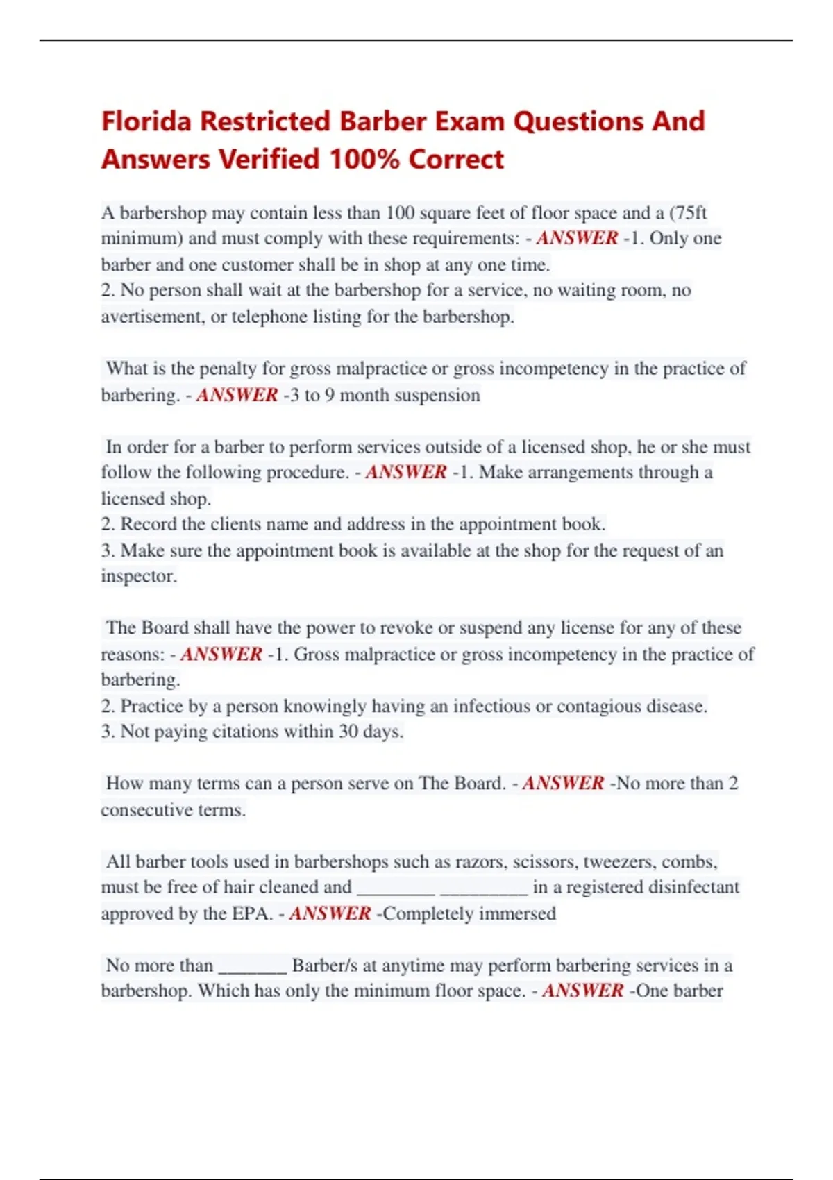 Florida Restricted Barber Exam Questions And Answers Verified 100% Correct