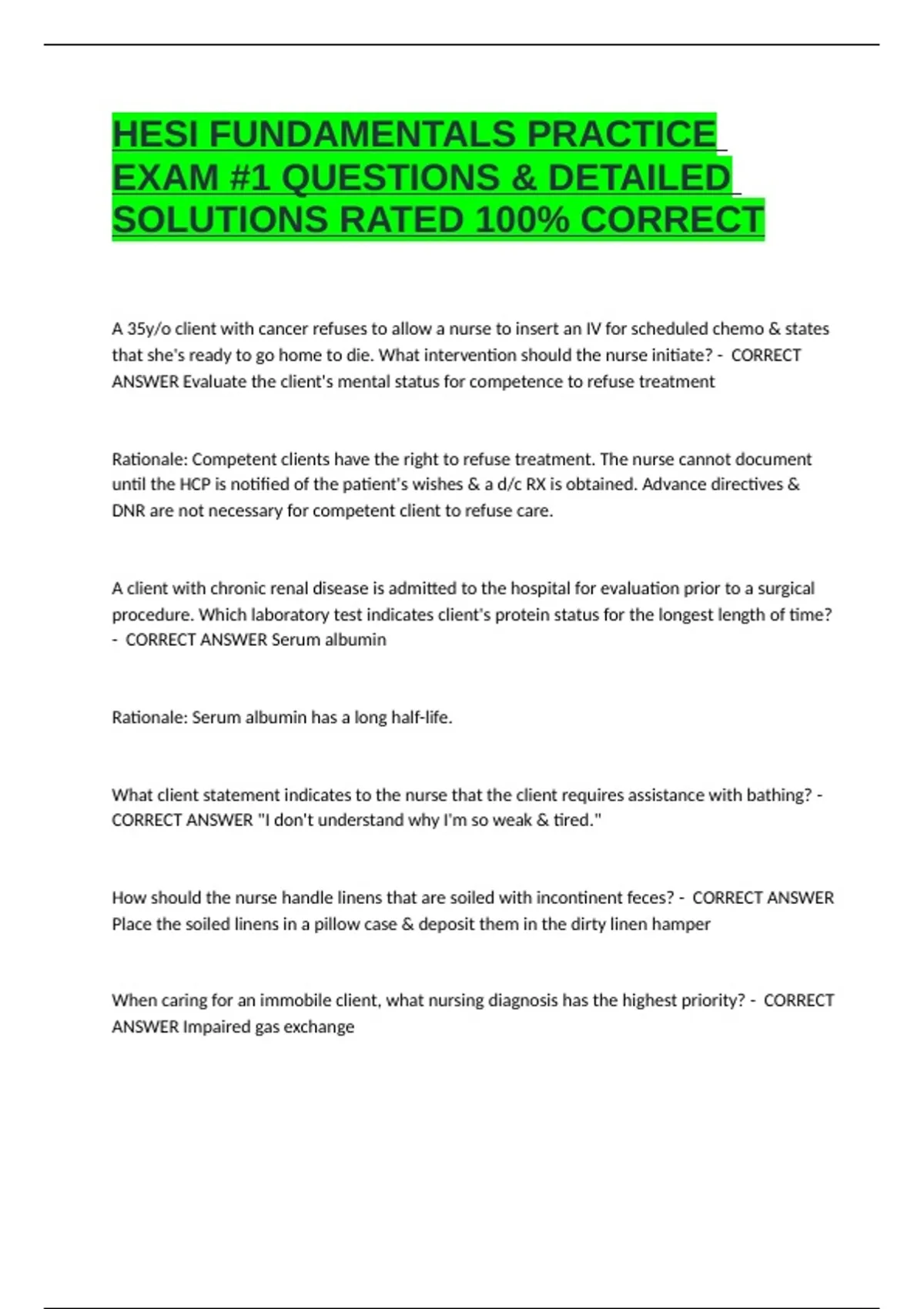 HESI FUNDAMENTALS PRACTICE EXAM #1 QUESTIONS & DETAILED SOLUTIONS RATED 100% CORRECT