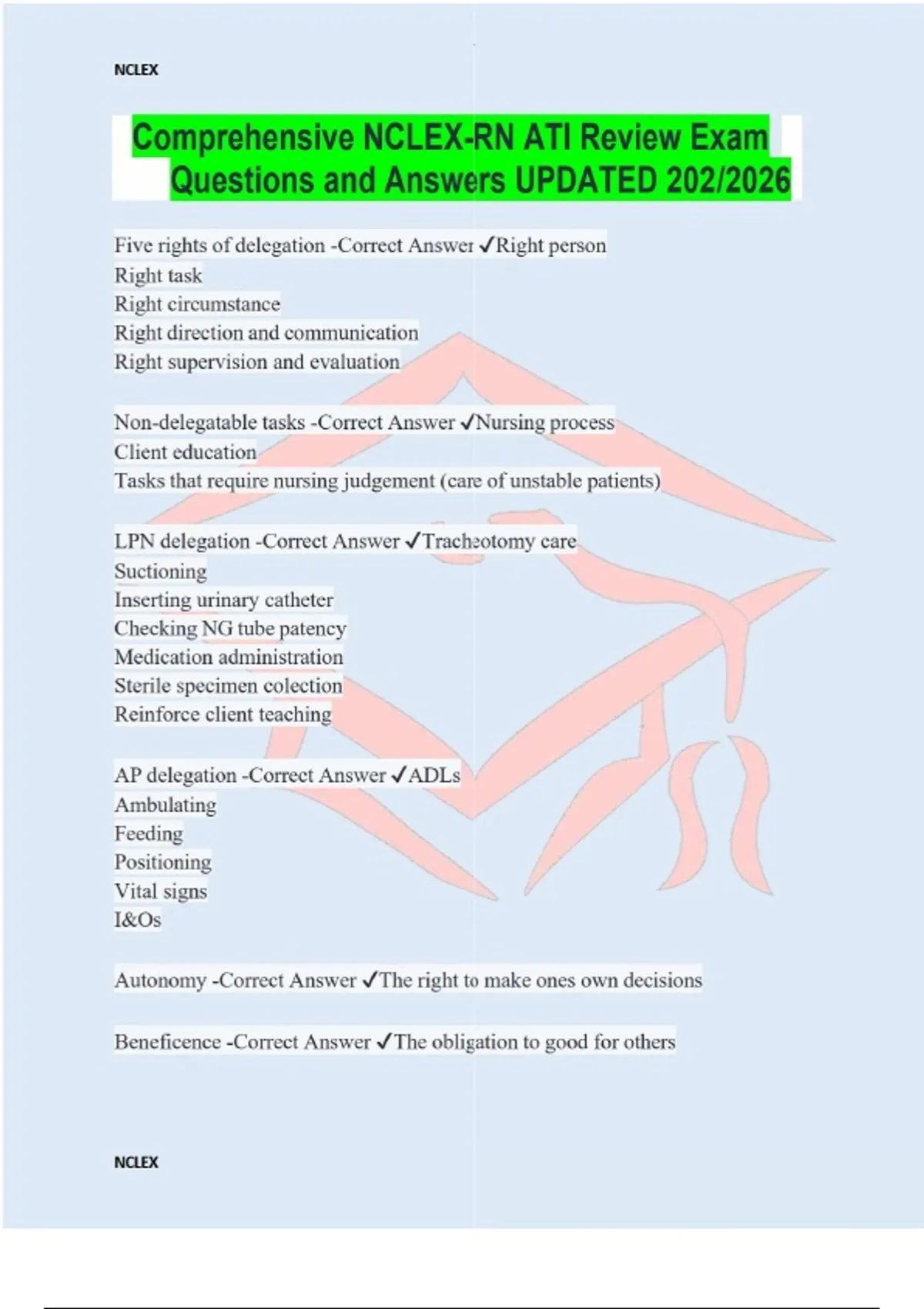 Maximize your NCLEX-RN and ATI scores with this ultimate, UPDATED 2025 Q&A guide! This comprehensive study tool delivers verified answers across all critical testing areas, including: Management of Care: The 5 Rights of Delegation, Non-Delegatable Tasks (LPN/AP), and Core Ethical Principles (Beneficence, Veracity, Fidelity). Pharmacology: Essential Antidotes (e.g., Naloxone, Protamine Sulfate) and detailed drug classes (ACE-I, Beta-Blockers, Statins). Clinical: Critical Lab Values (INR, PT, Electrolytes), Triage tags (RED/YELLOW), and complex conditions like DKA, SIADH, Cushing's Triad, and Abruptio Placentae. From pediatrics (APGAR, Reflexes, Motor Skills) to maternity (Nagele's Rule, Preeclampsia), this guide is your all-in-one resource. Stop studying outdated material. Get the 2025 advantage now and ensure you pass the NCLEX the first time! NCLEX Comprehensive NCLEX-RN ATI Review Exam Questions and Answers UPDATED 202/2026 Five rights of delegation -Correct Answer Right person Right task Right circumstance Right direction and communication Right supervision and evaluation Non-delegatable tasks -Correct Answer Nursing process Client education Tasks that require nursing judgement (care of unstable patients) LPN delegation -Correct Answer Tracheotomy care Suctioning Inserting urinary catheter Checking NG tube patency Medication administration Sterile specimen colection Reinforce client teaching AP delegation -Correct Answer ADLs Ambulating Feeding Positioning Vital signs I&Os Autonomy -Correct Answer The right to make ones own decisions Beneficence -Correct Answer The obligation to good for others NCLEX NCLEX Confidentiality -Correct Answer The obligation to observe the privacy of another and maintain strict confidence Fidelity -Correct Answer The obligation to be faithful to agreements and responsibilities, to keep promises Justice -Correct Answer The obligation to be fair to all people Nonmaleficence -Correct Answer The obligation to do no harm to others Paternalism -Correct Answer Assuming the right to make decisions for another Veracity -Correct Answer The obligation to tell the truth Nurses role of informed consent -Correct Answer Ensure the provider gave the necessary information Ensure the client understands the procedure Patient must be competent to sign informed consent Witness the clients signature Notify the provider if clarification is needed Mandatory Reporting -Correct Answer Abuse - vulnerable populations Communicable diseases Malpractice -Correct Answer The failure of a person with professional training to act in a reasonable an prudent manner within the identified scope of practice Negligence -Correct Answer The omission to do something that a reasonable person would do or something that a reasonable person would not do Emergency class 1 (red tag) -Correct Answer Immediate threat to life Do not delay care NCLEX NCLEX Urgent class 2 (yellow tag) -Correct Answer Major injuries that require treatment Delay of 30 minutes to 2 hours Non-urgent class 3 (green tag) -Correct Answer Minor injuries that do not require immediate attention Delay of 2-4 hours Expectant class 4 (black tag) -Correct Answer Expected/allowed to die Prepare for morgue TPN -Correct Answer Monitor serum glucose ever 4-6 hours Change dressing every 48 - 72 hours Change IV tubing and fluid every 24 hours If solution is temporarily unavailable, administer 10% dextrose in water to prevent hypoglycemia Acetaminophen (antidote) -Correct Answer Acetylcysteine (antidote) Benzodiazepine (antidote) -Correct Answer Flumazenil (antidote) Curare (antidote) -Correct Answer Edrophonium (antidote) Cyanide poisoning (antidote) -Correct Answer Methylene blue (antidote) Digitalis: (antidote) -Correct Answer Digoxin immune FAB (antidote) Ethylene poisoning (antidote) -Correct Answer Fomepizole (antidote) Heparin and enoxaparin (antidote) -Correct Answer Protamine sulfate (antidote) Iron (antidote) -Correct Answer Deferoxamine (antidote) Lead (antidote) -Correct Answer Succimer (antidote) NCLEX NCLEX Magnesium sulfate (antidote) -Correct Answer Calcium gluconate 10% (antidote) Narcotics (antidote) -Correct Answer Naloxone (antidote) Warfarin (antidote) -Correct Answer Phytonadione (vitamin K)(antidote) Calcium channel blockers -Correct Answer Suffix: dipine Causes: arterial dilation and decreased BP For: angina and HTN, verapamil and diltazem can be used for a-fib, a-flutter, svt Precautions: digoxin and beta blockers Contraindication: heart failure, heart block, of bradycardia Side effects: reflex tachycardia, peripheral edema, and toxicity Monitor: BP and HR Do not drink grapefruit juice Do not crush/chew IV administration 2-3 minutes ACE inhibitor -Correct Answer Suffix: pril For: hypertension, heart failure, MI, and diabetic nephropathy Monitor potassium, BP, angioedema Captopril should be taken 1hr before meals ARBS -Correct Answer Suffix: tan For: hypertension, heart failure, MI, and diabetic nephropathy Monitor potassium, BP, angioedema Beta 2 adrenergic agonists -Correct Answer For: Respiratory Albuterol - short acting (inhaled) for acute bronchospasm, onset 5-15 min Formoterol - long acting/long-term control (inhaled), onset 1-3 min, duration 10hr Salmeterol - long acting/long-term control (inhaled), onset 10-20 min, duration 12hr Terbutaline - long acting/long-term control (oral) NCLEX NCLEX Precautions: increased heart rate, tremors, beta blockers will decrease effect, MAOIs will increase effect Antilipemic -Correct Answer Suffix: statin For: reduction of formation of cholesterol precursors Drug interactions: digoxin, warfarin, thyroid hormones, thiazide diuretics, phenobarbital, NASIDs, tetracycline, beta blockers, gemfibrozil, glipizide, glyburide, oral contraceptices, and phenytoin Do not administer with grapefruit juice Glucocorticoids -Correct Answer Suffix: one, ide & ate For: Prevention of inflammatory responses by suppression of airway mucus production Interaction: DM may require higher doses Side effects: in