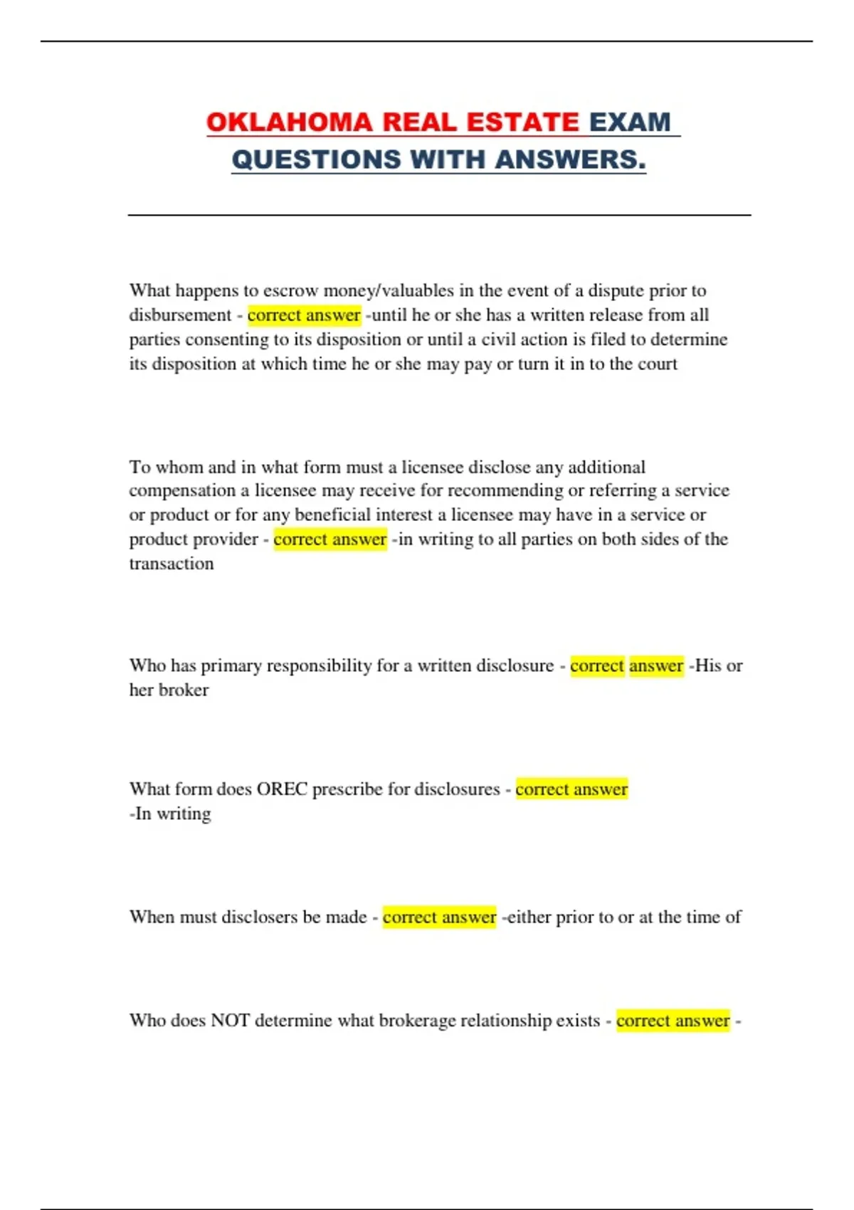 This document contains an extensive collection of practice questions and correct answers covering all major topics required for the Oklahoma Real Estate Licensing Exam. It includes material on OREC rules, broker responsibilities, license requirements, trust accounts, disclosures, penalties, continuing education, the Education and Recovery Fund, and detailed definitions used within Oklahoma real estate law. The content is formatted in clear Q&A style, making it a complete and highly practical study resource for exam preparation.
