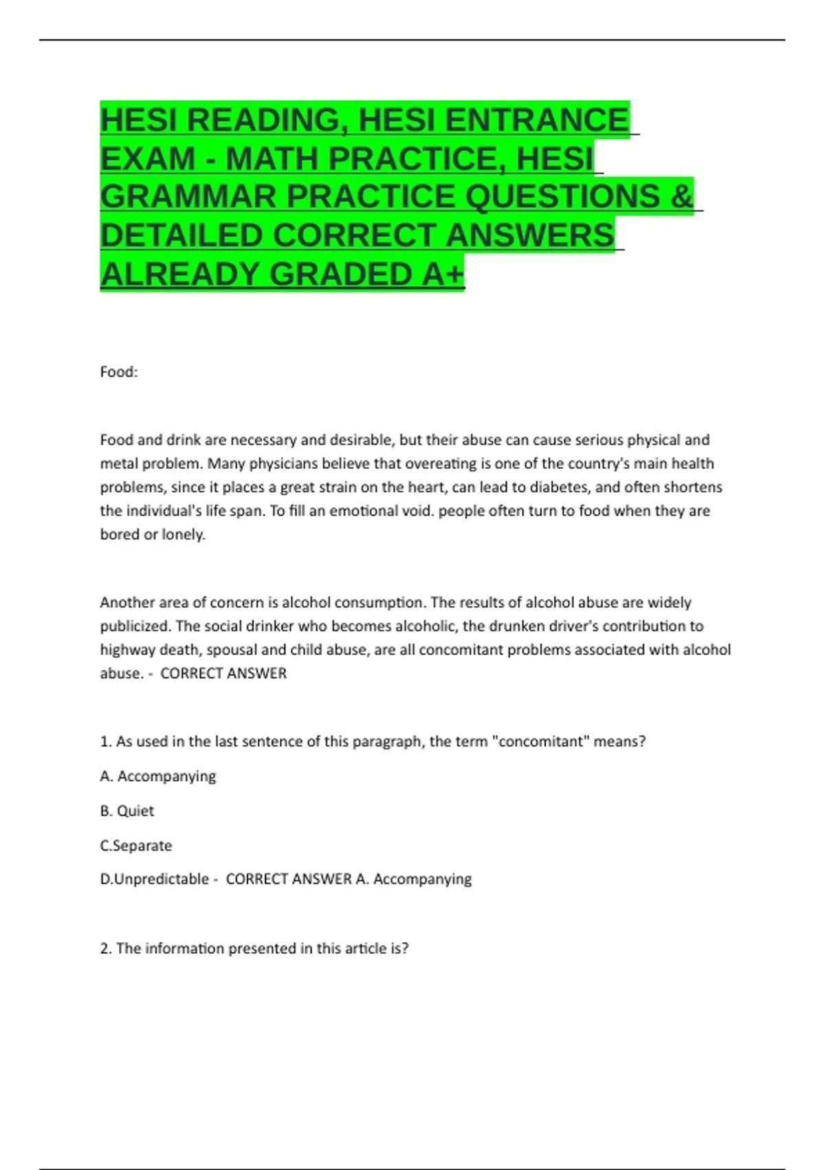 HESI READING, HESI ENTRANCE EXAM - MATH PRACTICE, HESI GRAMMAR PRACTICE QUESTIONS & DETAILED CORRECT ANSWERS ALREADY GRADED A+
