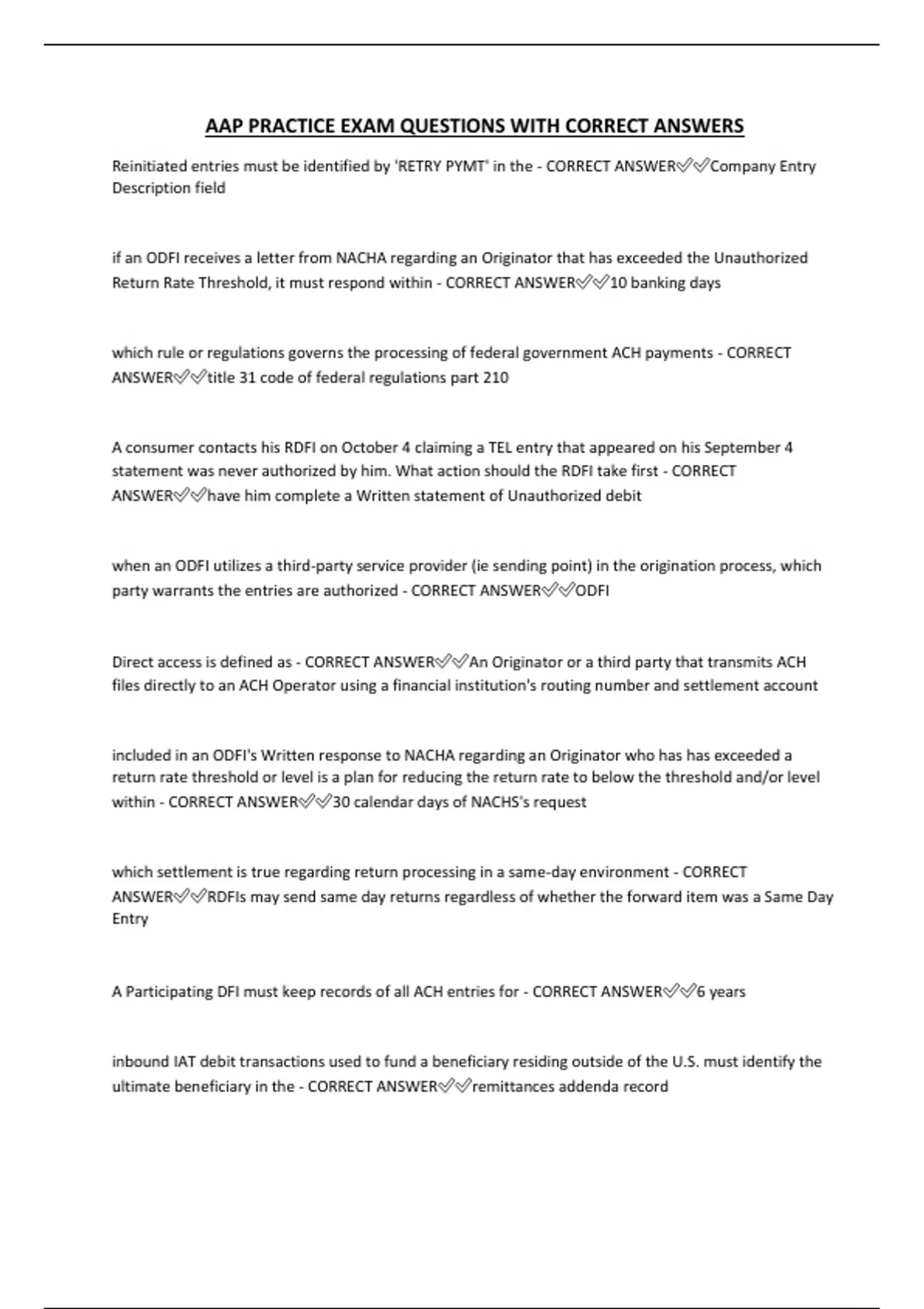 AAP PRACTICE EXAM QUESTIONS WITH CORRECT ANSWERS Reinitiated entries must be identified by 'RETRY PYMT' in the - CORRECT ANSWERCompany Entry Description field