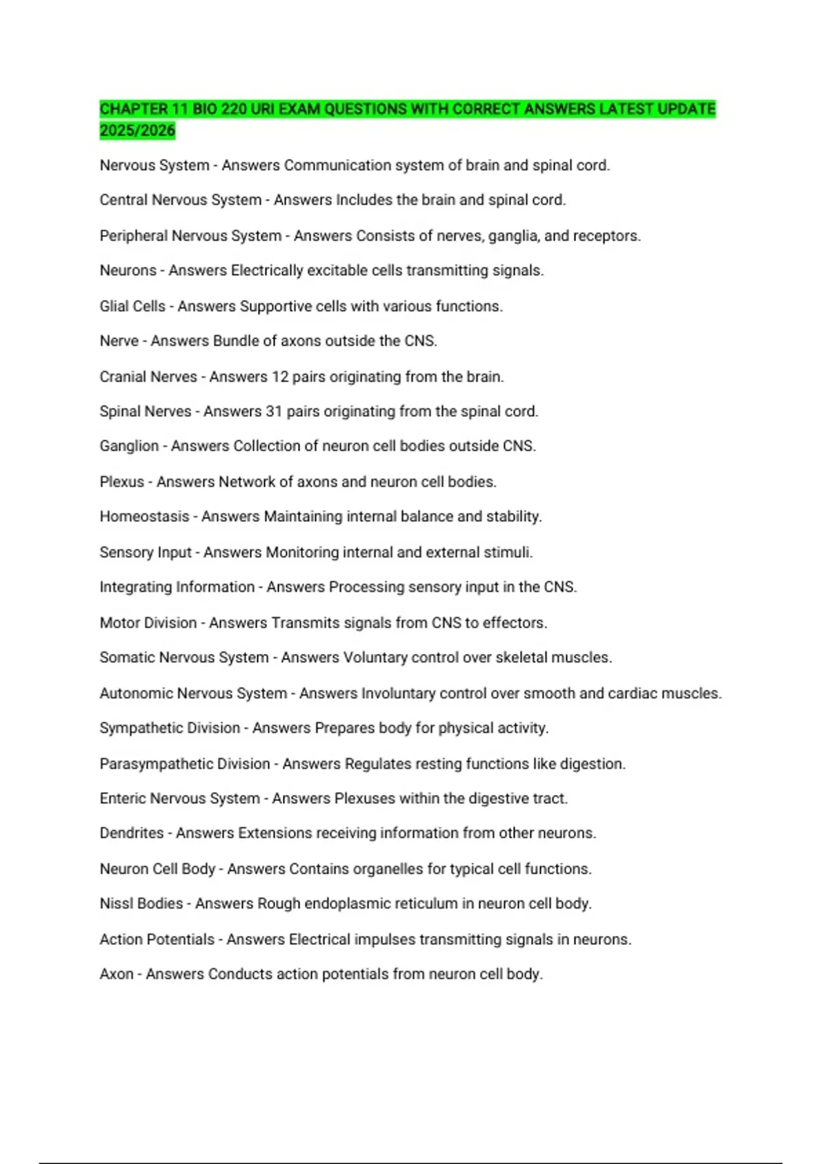 CHAPTER 11 BIO 220 URI EXAM QUESTIONS WITH CORRECT ANSWERS LATEST UPDATE 2025/2026 Nervous System - Answers Communication system of brain and spinal cord. Central Nervous System - Answers Includes the brain and spinal cord. Peripheral Nervous System - Answers Consists of nerves, ganglia, and receptors. Neurons - Answers Electrically excitable cells transmitting signals. Glial Cells - Answers Supportive cells with various functions. Nerve - Answers Bundle of axons outside the CNS. Cranial Nerves - Answers 12 pairs originating from the brain. Spinal Nerves - Answers 31 pairs originating from the spinal cord. Ganglion - Answers Collection of neuron cell bodies outside CNS. Plexus - Answers Network of axons and neuron cell bodies. Homeostasis - Answers Maintaining internal balance and stability. Sensory Input - Answers Monitoring internal and external stimuli. Integrating Information - Answers Processing sensory input in the CNS. Motor Division - Answers Transmits signals from CNS to effectors. Somatic Nervous System - Answers Voluntary control over skeletal muscles. Autonomic Nervous System - Answers Involuntary control over smooth and cardiac muscles. Sympathetic Division - Answers Prepares body for physical activity. Parasympathetic Division - Answers Regulates resting functions like digestion. Enteric Nervous System - Answers Plexuses within the digestive tract. Dendrites - Answers Extensions receiving information from other neurons. Neuron Cell Body - Answers Contains organelles for typical cell functions. Nissl Bodies - Answers Rough endoplasmic reticulum in neuron cell body. Action Potentials - Answers Electrical impulses transmitting signals in neurons. Axon - Answers Conducts action potentials from neuron cell body. Axon Hillock - Answers Initial segment where action potentials are generated.