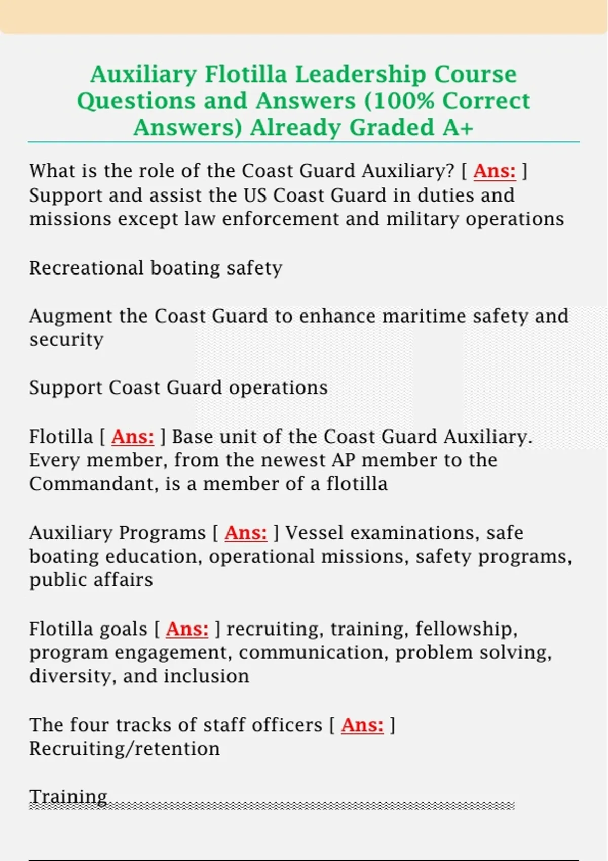 Auxiliary Flotilla Leadership Course Questions and Answers (100% Correct Answers) Already Graded A+