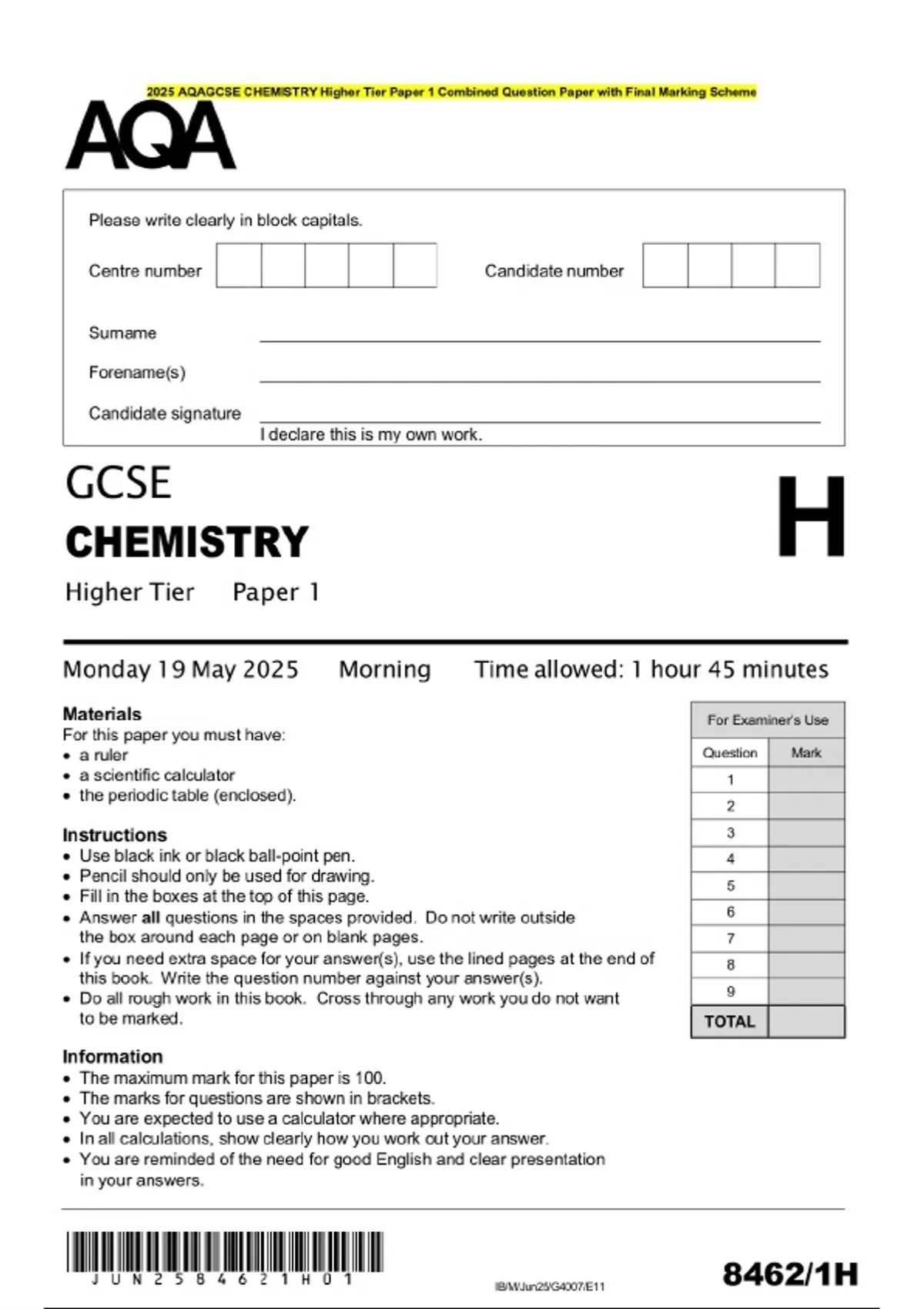 2025 AQAGCSE CHEMISTRY Higher Tier Paper 1 Combined Question Paper with Final Marking Scheme