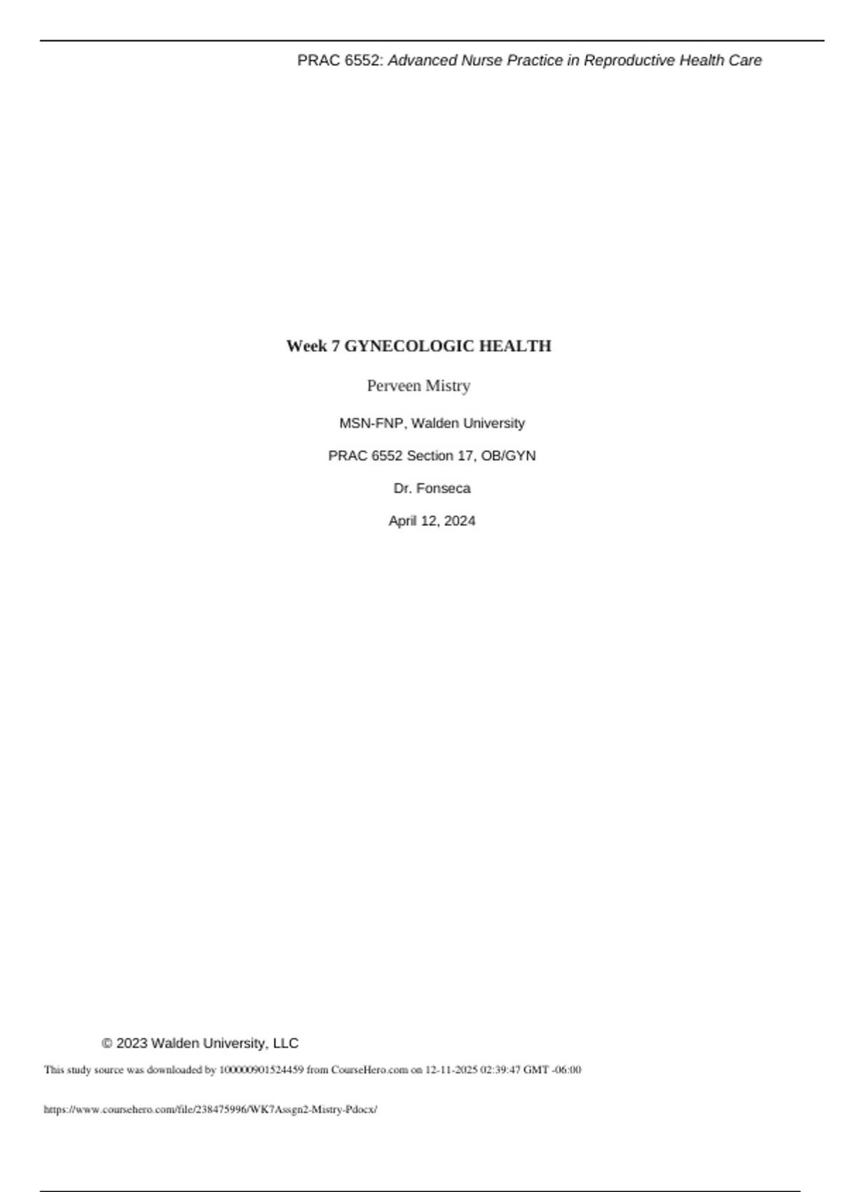 PRAC 6552 Section 17, OB/GYN Week 7 GYNECOLOGIC HEALTH (Already Graded A+)