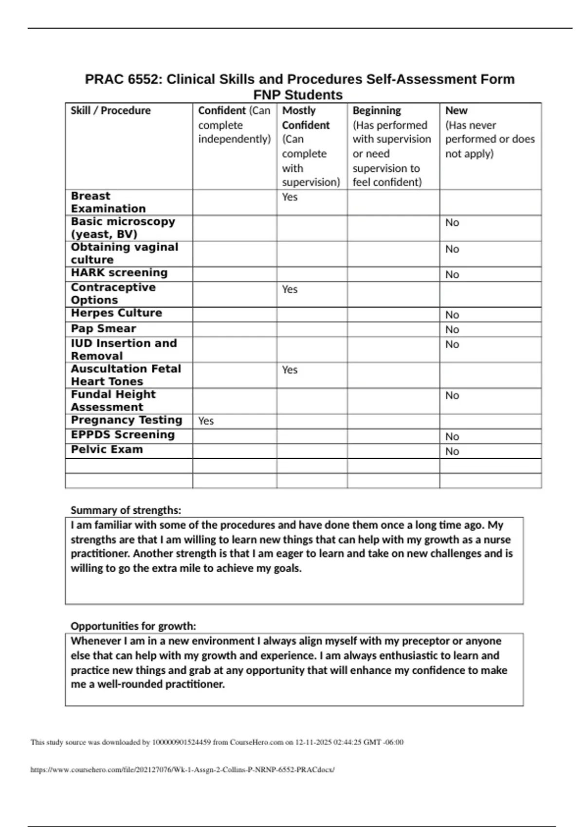 PRAC 6552: Clinical Skills and Procedures Self-Assessment Form