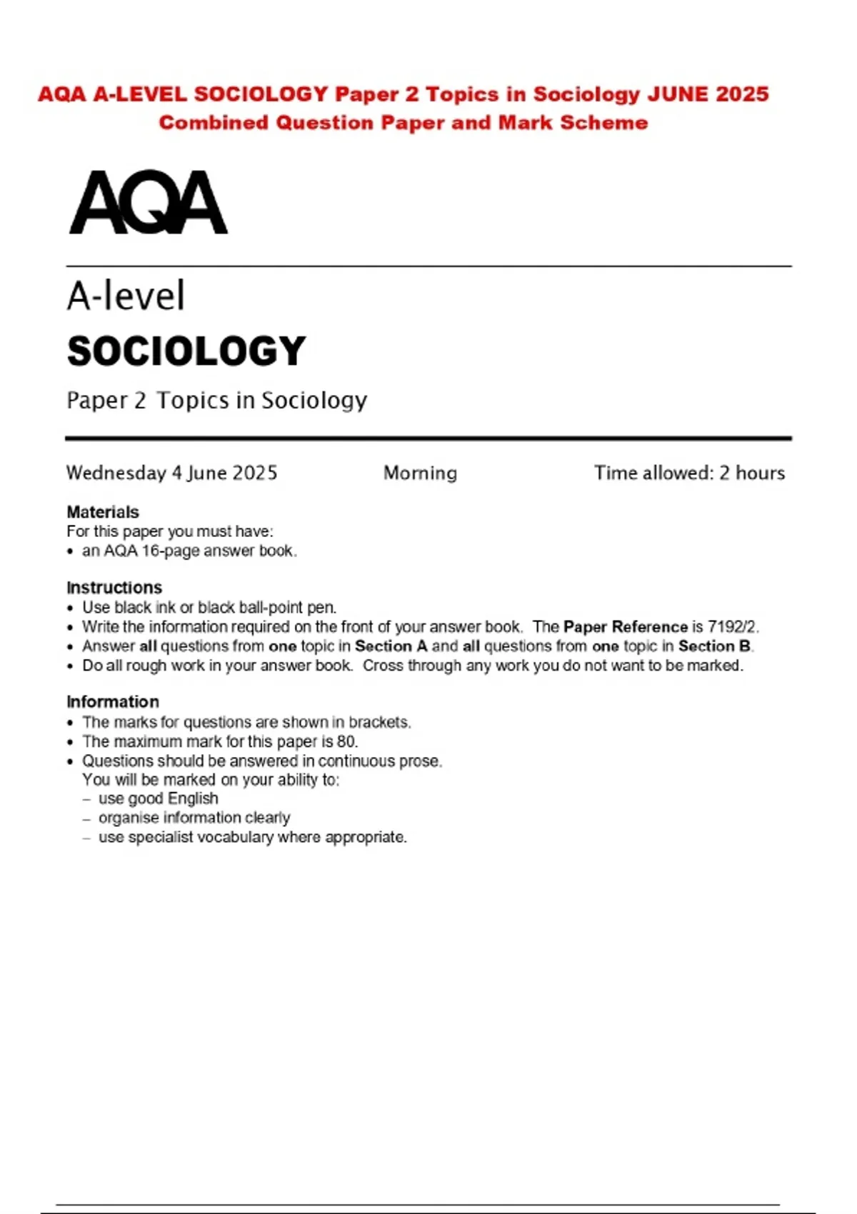 AQA A-LEVEL SOCIOLOGY Paper 2 Topics in Sociology JUNE 2025 Combined Question Paper and Mark Scheme