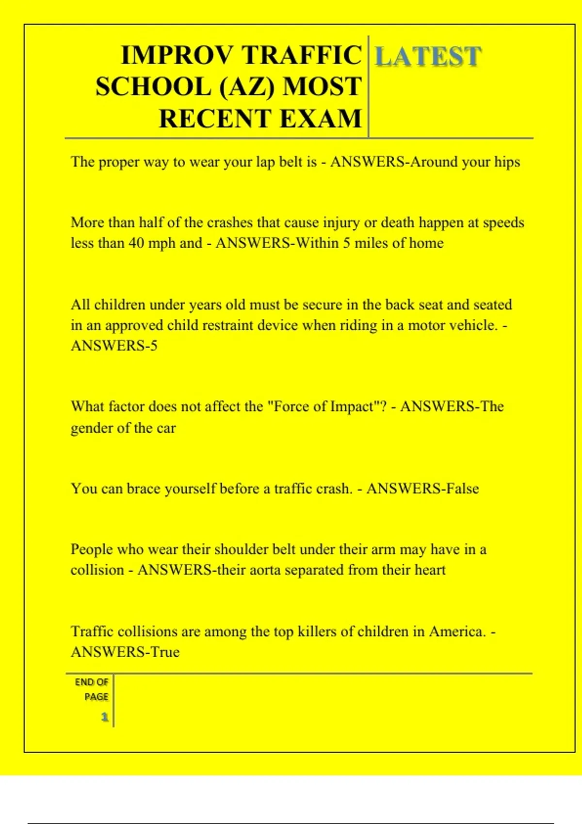 IMPROV TRAFFIC SCHOOL (AZ) MOST RECENT EXAM QUESTIONS AND ANSWERS 2026