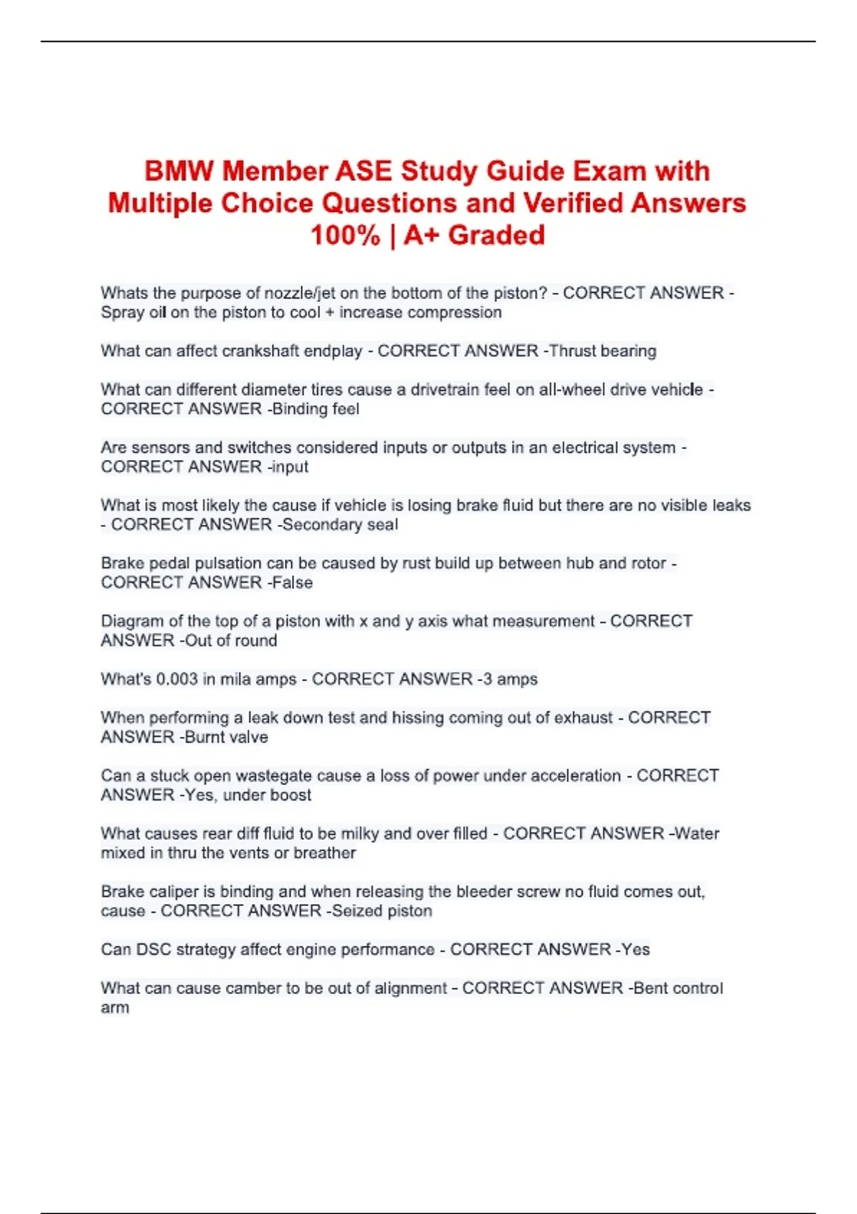 BMW Member ASE Study Guide Exam with Multiple choice questions and Verified Answers